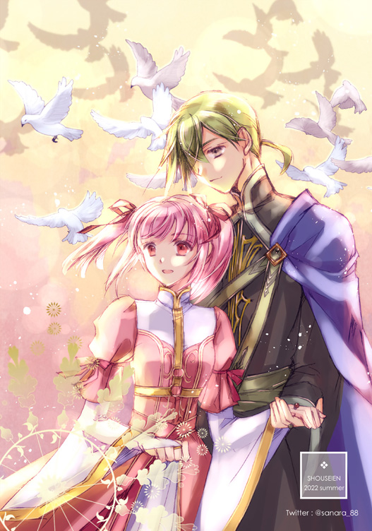 1boy 1girl artist_name bird black_shirt cape cornelius_(honzuki_no_gekokujou) dated dress gradient_background green_hair hair_over_one_eye hair_ribbon hannelore_(honzuki_no_gekokujou) hetero holding_hands honzuki_no_gekokujou long_sleeves outdoors pink_dress pink_eyes pink_hair purple_eyes ribbon sekura shirt short_twintails twintails
