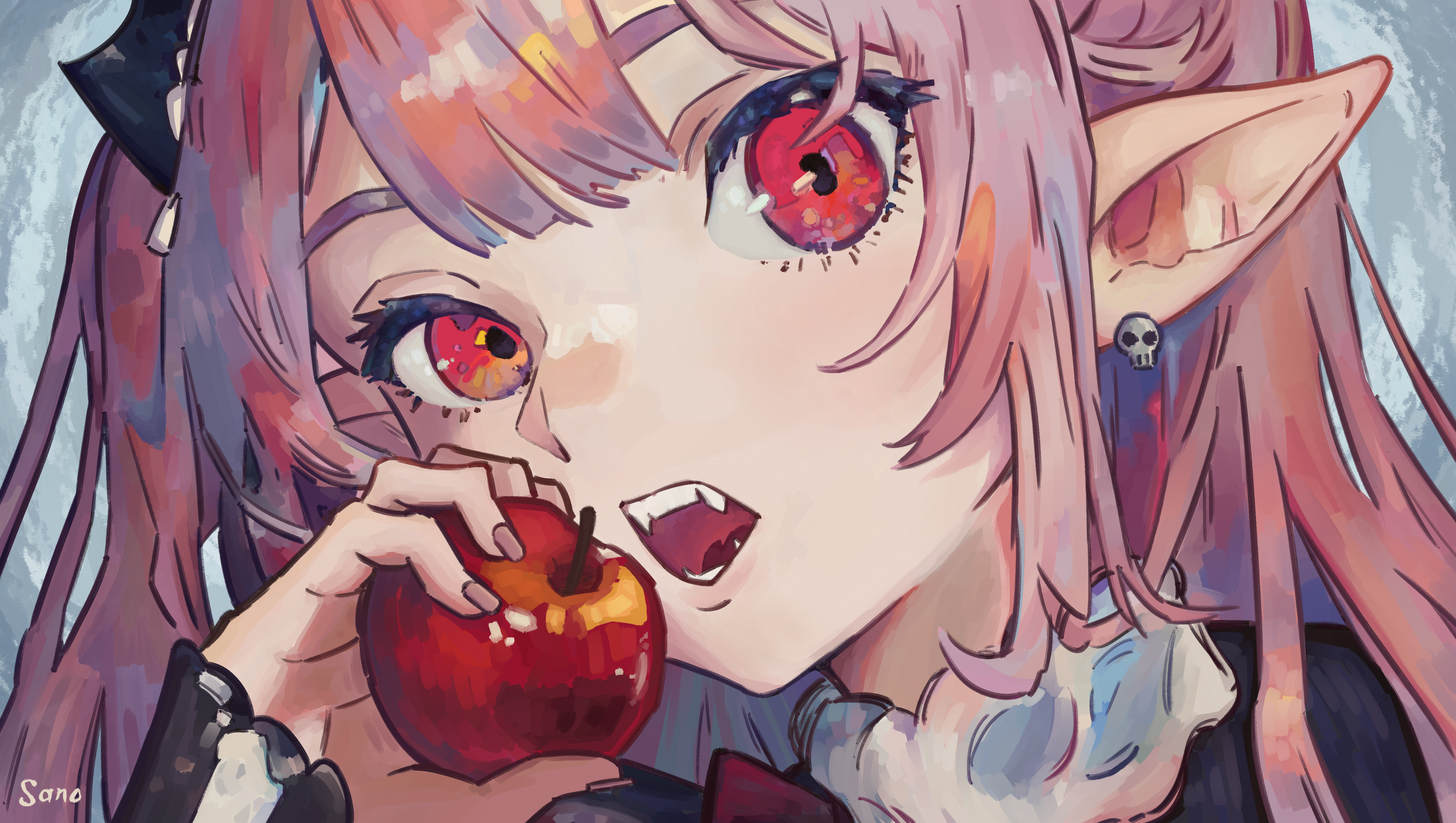 1girl absurdres apple bat_wings fangs food fruit hair_ornament highres holding holding_food holding_fruit impasto impressionism krul_tepes long_hair looking_at_viewer open_mouth owari_no_seraph pink_hair pointy_ears red_eyes sanoarts teeth twintails vampire wings
