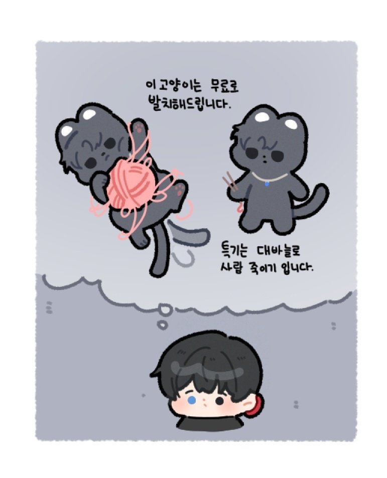 1boy animal animalization bbing_zzi black_eyes black_hair blue_eyes blush border cat chibi closed_mouth commentary_request eoduun_badaui_deungbul-i_doeeo grey_background heterochromia imagining jewelry knitting_needle korean_commentary korean_text male_focus necklace needle park_moo-hyun pawpads shin_hae-ryang short_hair simple_background solid_circle_eyes speech_bubble thought_bubble translation_request white_border yarn yarn_ball