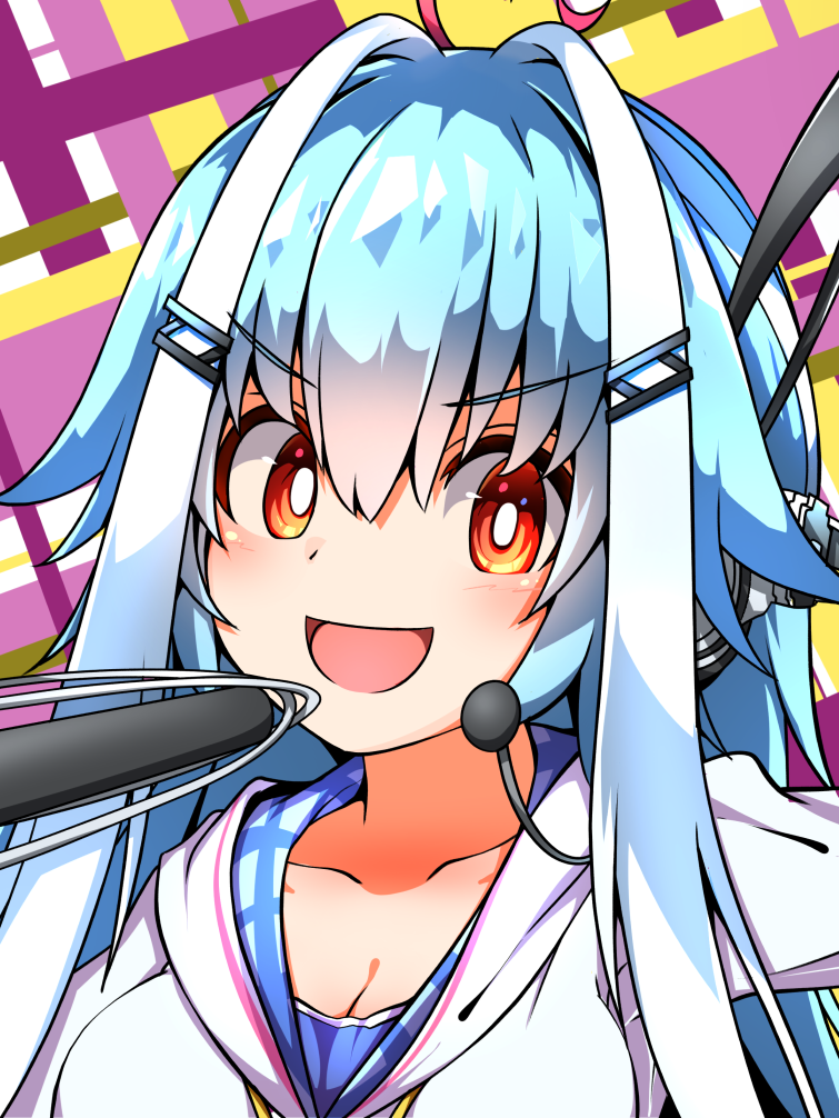 1girl :d ahoge bemani blue_hair breasts cleavage hair_between_eyes hair_ornament hairclip headphones ichika_(bemani) kredorf light_blue_hair long_hair looking_at_viewer medium_breasts microphone multicolored_background multicolored_hair open_mouth orange_eyes pink_hair smile solo upper_body v-shaped_eyebrows white_hair
