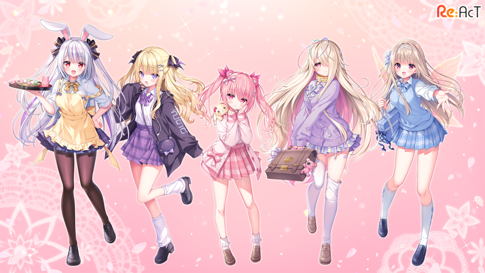 5girls animal_ears apron ayamo_nono bag black_footwear black_jacket blonde_hair blush briefcase brown_footwear brown_hair brown_pantyhose brown_wings cardigan closed_mouth collared_shirt commentary_request copyright_name dress_shirt fairy_wings grey_hair hair_between_eyes hair_over_one_eye hands_up himekuma_ribon holding holding_tray hood hood_down hooded_jacket jacket kneehighs kulaku_lie loafers long_hair long_sleeves marumochi_tsukimi multiple_girls open_clothes open_jacket pantyhose pink_background pink_hair plaid_clothes plaid_skirt pleated_skirt puffy_long_sleeves puffy_sleeves purple_cardigan purple_skirt rabbit_ears re:act red_eyes sacraneco school_bag school_briefcase school_uniform shirt shoes short_sleeves shoulder_bag skirt sleeves_past_wrists socks strap_slip stuffed_animal stuffed_toy sweater_vest teddy_bear thighhighs tray tsukushi_aria twintails two_side_up very_long_hair virtual_youtuber white_shirt white_socks white_thighhighs wings yellow_apron