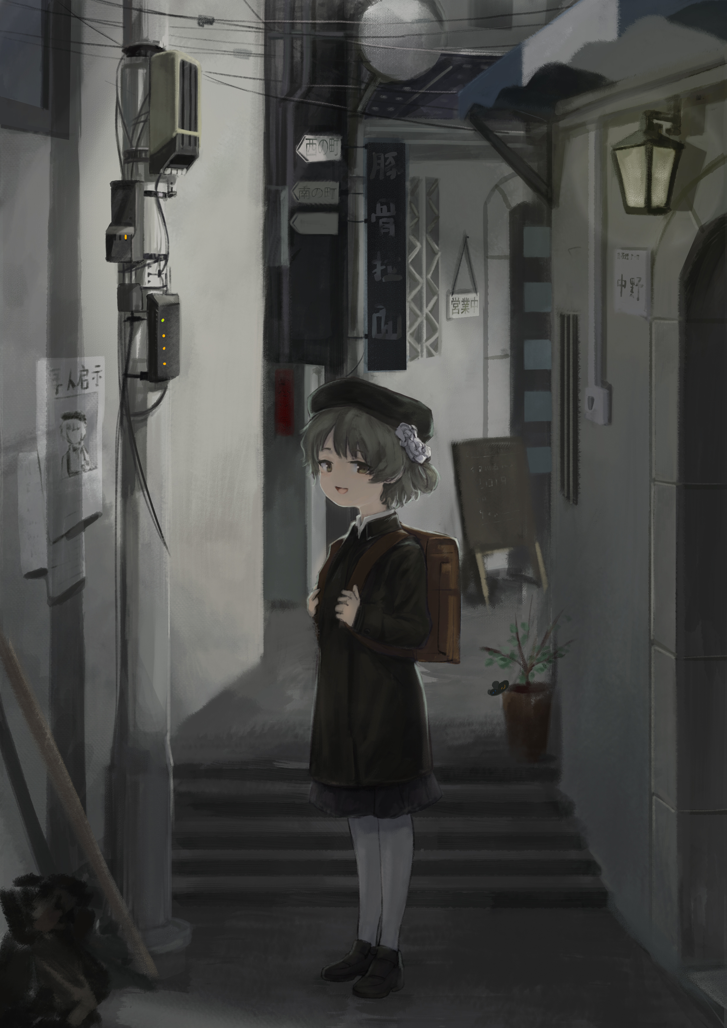 1girl absurdres akina_(odoru_nagi) alley backpack bag beret black_hat black_jacket black_skirt brown_bag brown_eyes commentary_request flower from_side full_body hair_flower hair_ornament hair_rings half-closed_eyes hands_up hat hatoba_tsugu highres holding_strap jacket light_brown_hair long_sleeves looking_at_viewer looking_to_the_side missing_poster open_mouth outdoors pantyhose plant potted_plant power_lines randoseru rose shoes short_hair sign single_hair_ring skirt smile solo stairs standing translation_request tsugu_(vtuber) utility_pole virtual_youtuber wall_lamp white_flower white_pantyhose white_rose
