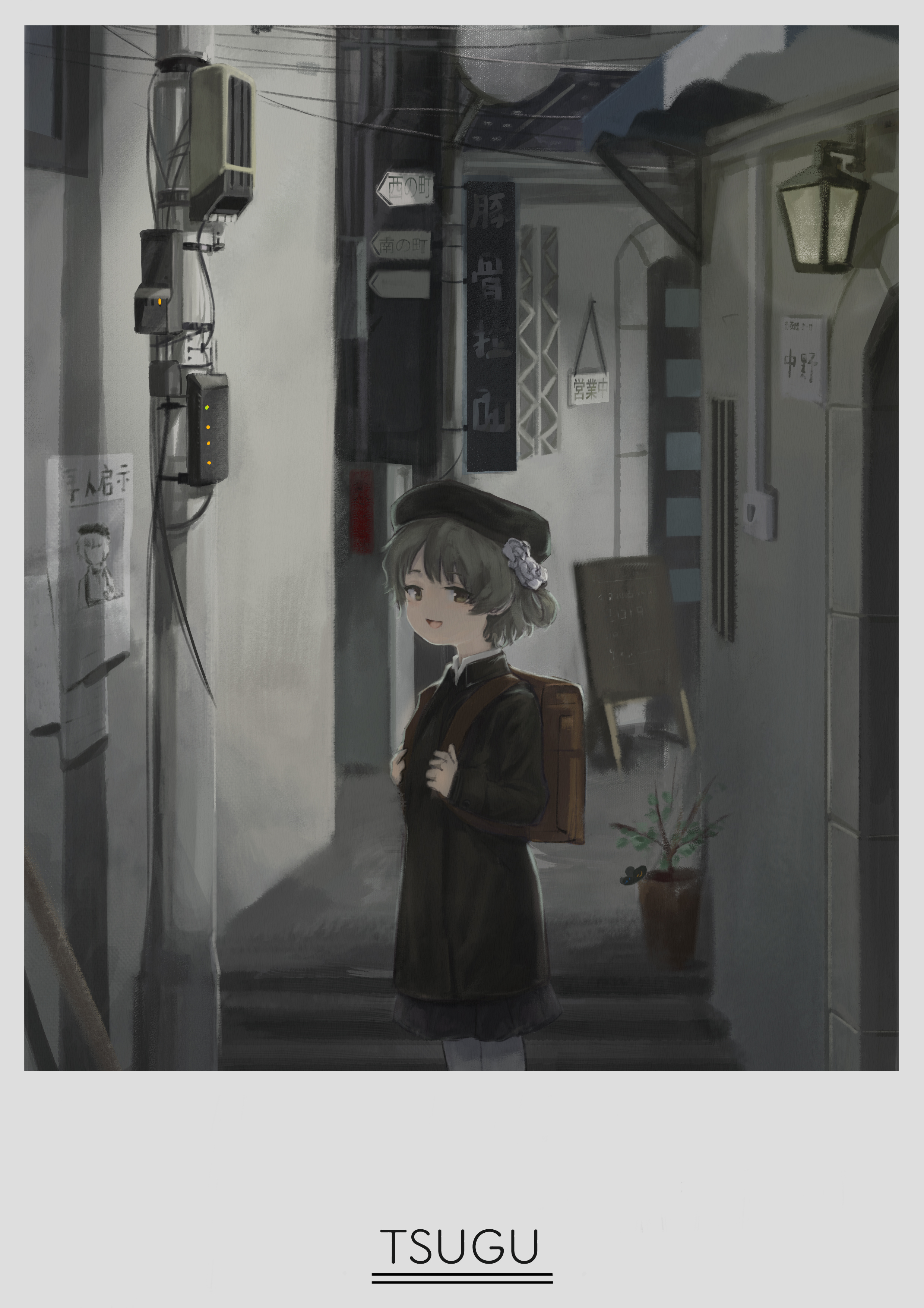 1girl absurdres akina_(odoru_nagi) alley backpack bag beret black_hat black_jacket black_skirt border brown_bag brown_eyes character_name commentary_request cropped_legs flower from_side hair_flower hair_ornament hair_rings half-closed_eyes hands_up hat hatoba_tsugu highres holding_strap jacket light_brown_hair long_sleeves looking_at_viewer looking_to_the_side missing_poster open_mouth outdoors pantyhose plant potted_plant power_lines randoseru rose short_hair sign single_hair_ring skirt smile solo stairs standing translation_request tsugu_(vtuber) utility_pole virtual_youtuber wall_lamp white_border white_flower white_pantyhose white_rose