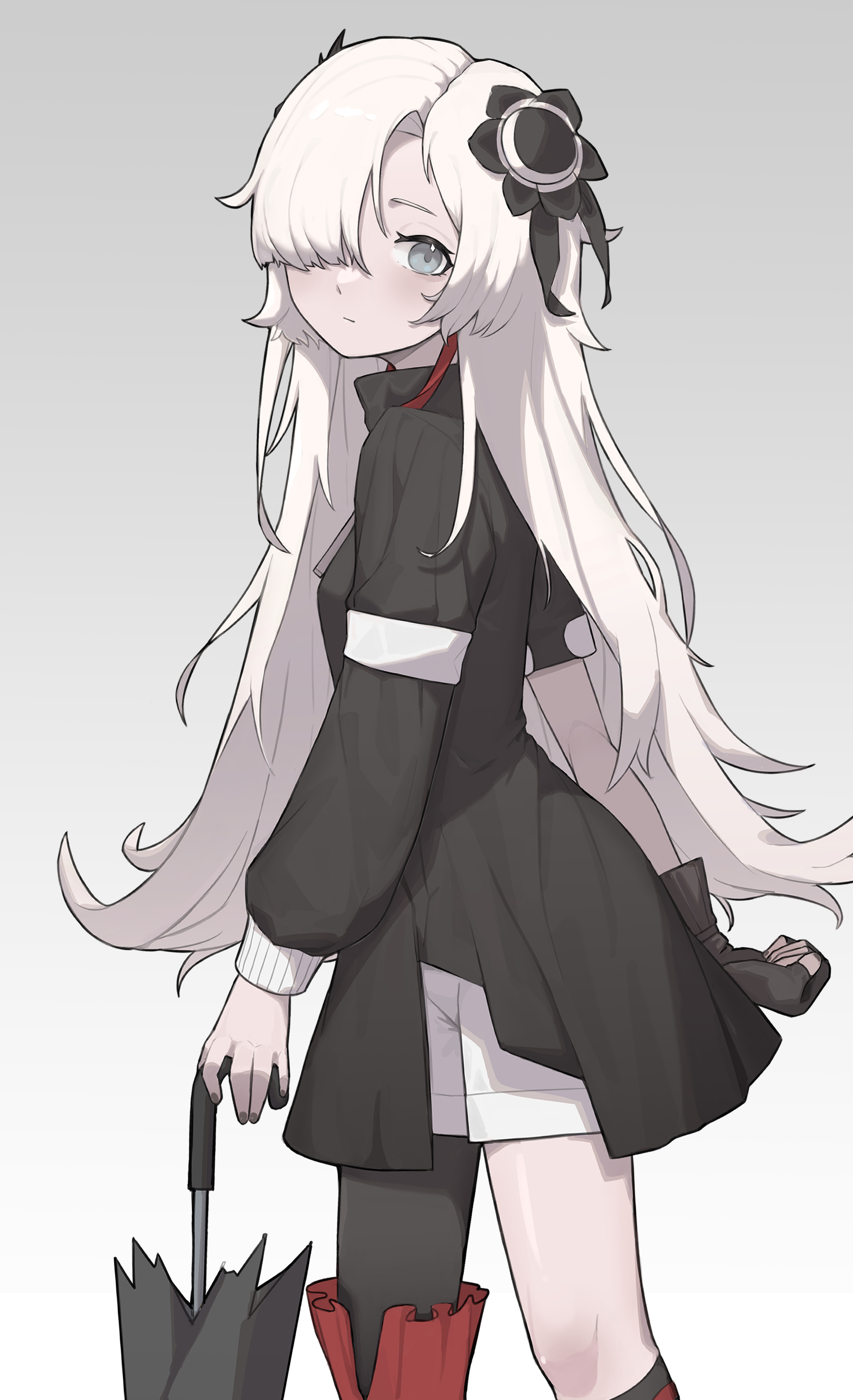 1girl absurdres arms_at_sides asymmetrical_legwear asymmetrical_sleeves black_coat black_flower black_socks black_thighhighs boots chinese_commentary closed_mouth closed_umbrella coat commentary_request expressionless feet_out_of_frame flower from_side grey_background grey_eyes hair_flower hair_ornament hair_over_one_eye high_collar highres holding holding_umbrella isekaijoucho kamitsubaki_studio knee_boots kneehighs light_blush long_hair looking_at_viewer looking_to_the_side messy_hair multicolored_hair namae_kunn one_eye_covered red_hair shorts simple_background single_knee_boot single_kneehigh single_sock single_thighhigh socks solo streaked_hair thighhighs umbrella uneven_legwear uneven_sleeves virtual_youtuber walking white_hair white_shorts zipper_pull_tab