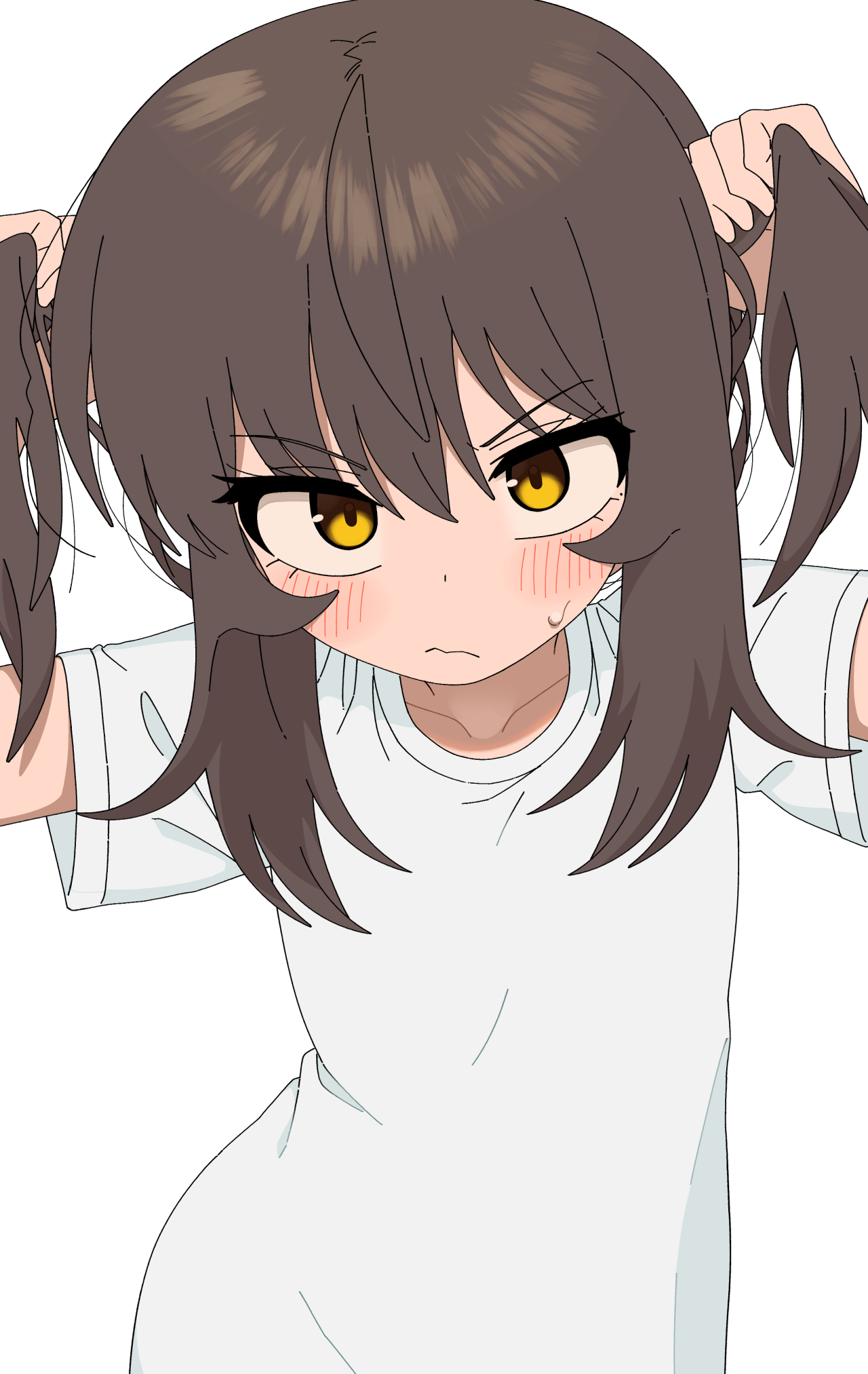 1girl annoyed black_hair blush closed_mouth embarrassed female_focus grabbing_own_hair highres holding_own_hair looking_at_viewer nakta original shirt simple_background solo sweatdrop t-shirt white_background white_shirt yellow_eyes