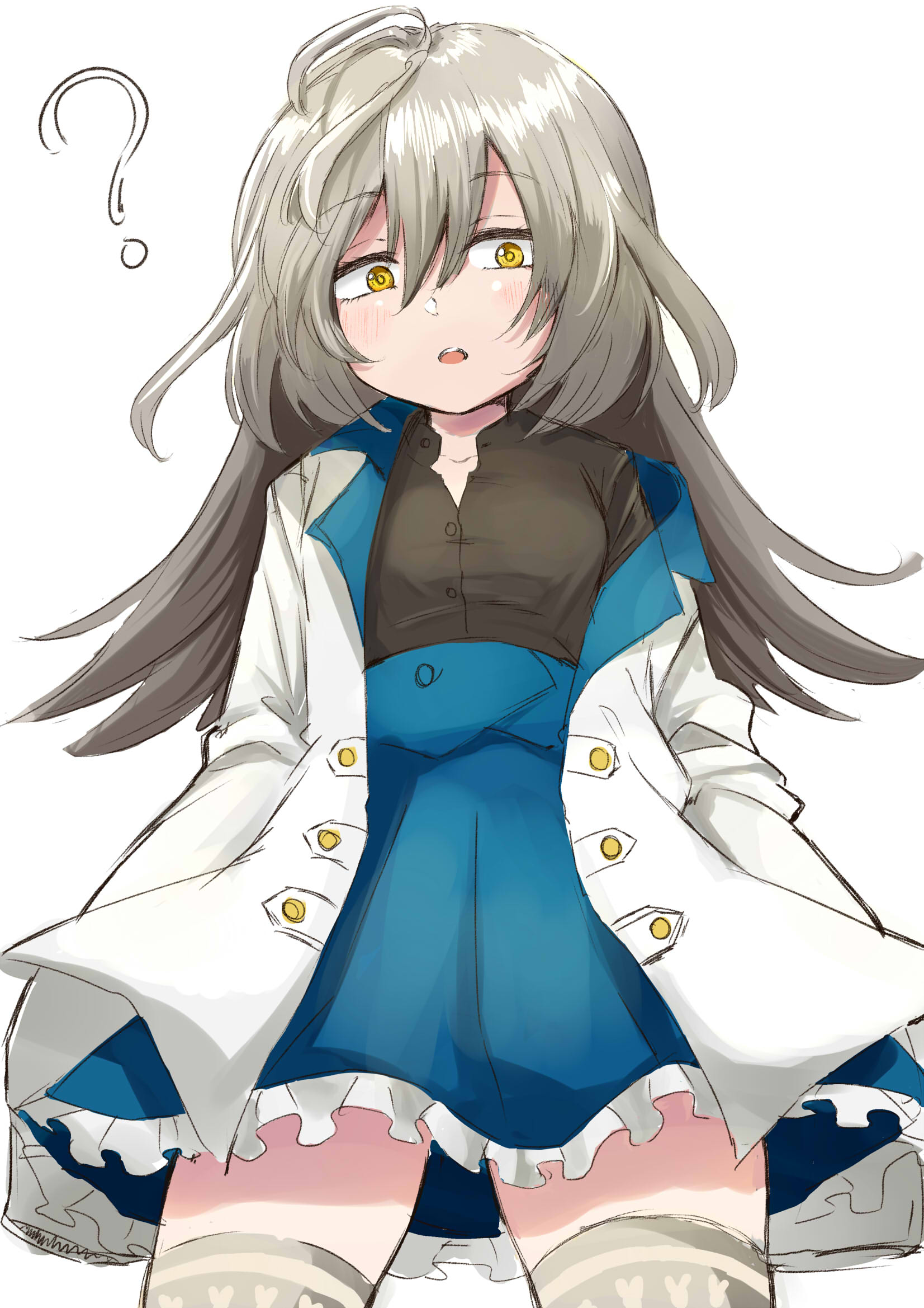 1girl ? ahoge animal_print arms_at_sides assault_lily black_shirt blue_skirt blush buttons collared_shirt commentary_request cowboy_shot frilled_skirt frills grey_hair grey_thighhighs hair_between_eyes herensuge_girls_academy_school_uniform high-waist_skirt highres jacket long_hair long_sleeves looking_at_viewer miniskirt misaka_hachirou multicolored_hair off_shoulder open_clothes open_jacket oversized_clothes parted_lips partially_unbuttoned print_thighhighs rabbit_print sasaki_ran school_uniform shirt simple_background skirt sleeves_past_fingers sleeves_past_wrists solo standing streaked_hair teeth thighhighs upper_teeth_only white_background white_jacket yellow_eyes zettai_ryouiki