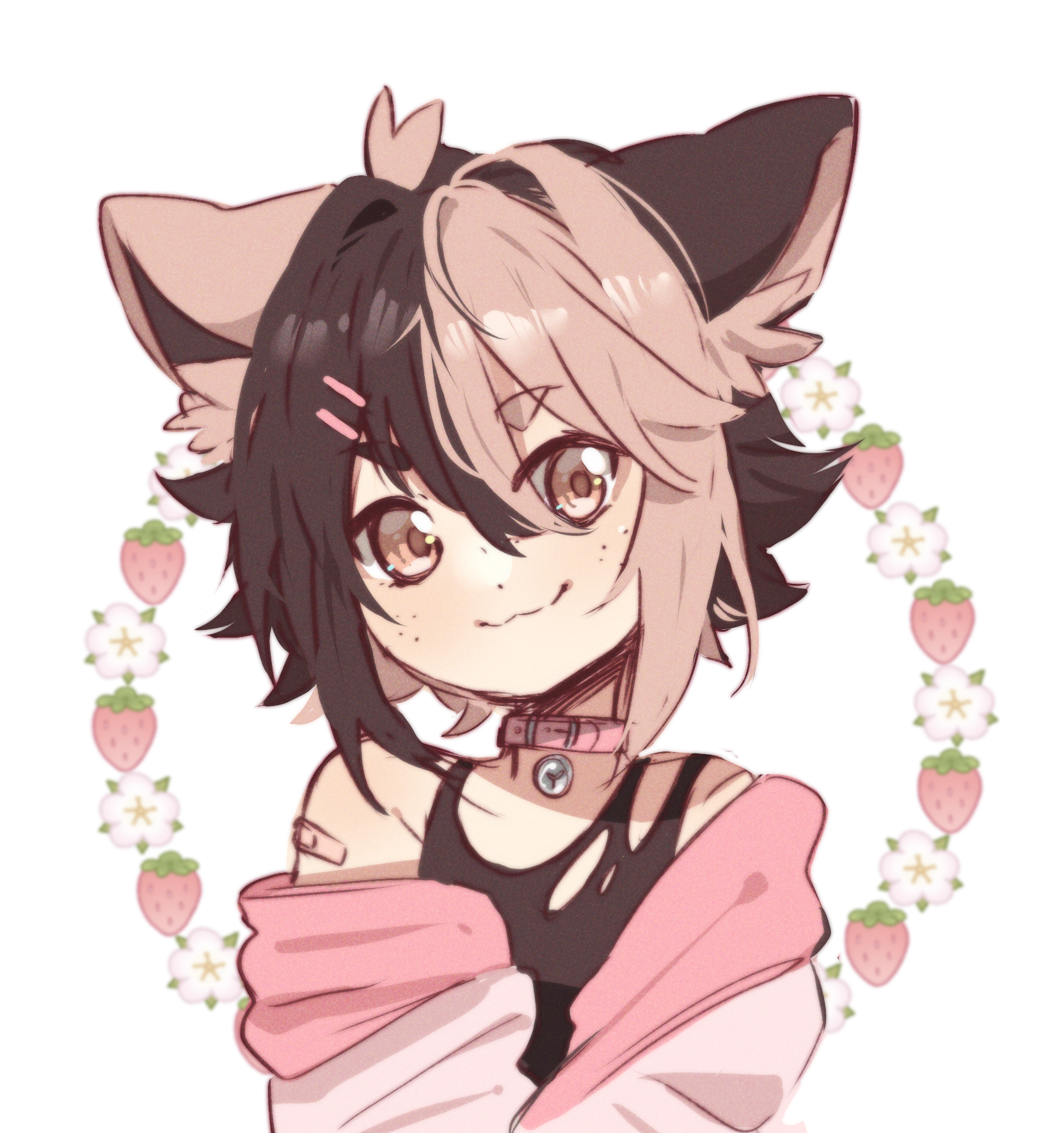 1girl animal_ears asymmetrical_hair bandaid bare_shoulders bell black_hair collar drawfag fig_(vtuber) flower food freckles fruit hair_ornament hairclip highres hood hoodie looking_at_viewer non-web_source pink_eyes pink_hair strawberry tank_top torn_clothes virtual_youtuber