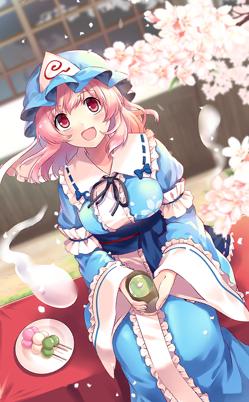 1girl black_bow black_bowtie blue_bow blue_hat blue_kimono blue_ribbon blue_sash blush bow bowtie cherry_blossoms cherry_tree cup dango eyelashes falling_petals floral_print food frilled_garter frilled_hat frilled_kimono frilled_sailor_collar frills ghost green_tea hakugyokurou hat holding holding_cup japanese_clothes kapuchii kimono leaf long_sleeves looking_up medium_hair mob_cap obi official_art open_mouth petals pink_hair plate ribbon ribbon-trimmed_collar ribbon_trim saigyouji_yuyuko sailor_collar sanshoku_dango sash sitting sleeve_garter smile swirl tea touhou touhou_cannonball triangular_headpiece veil wagashi waist_bow white_garter white_sailor_collar white_veil wide_sleeves