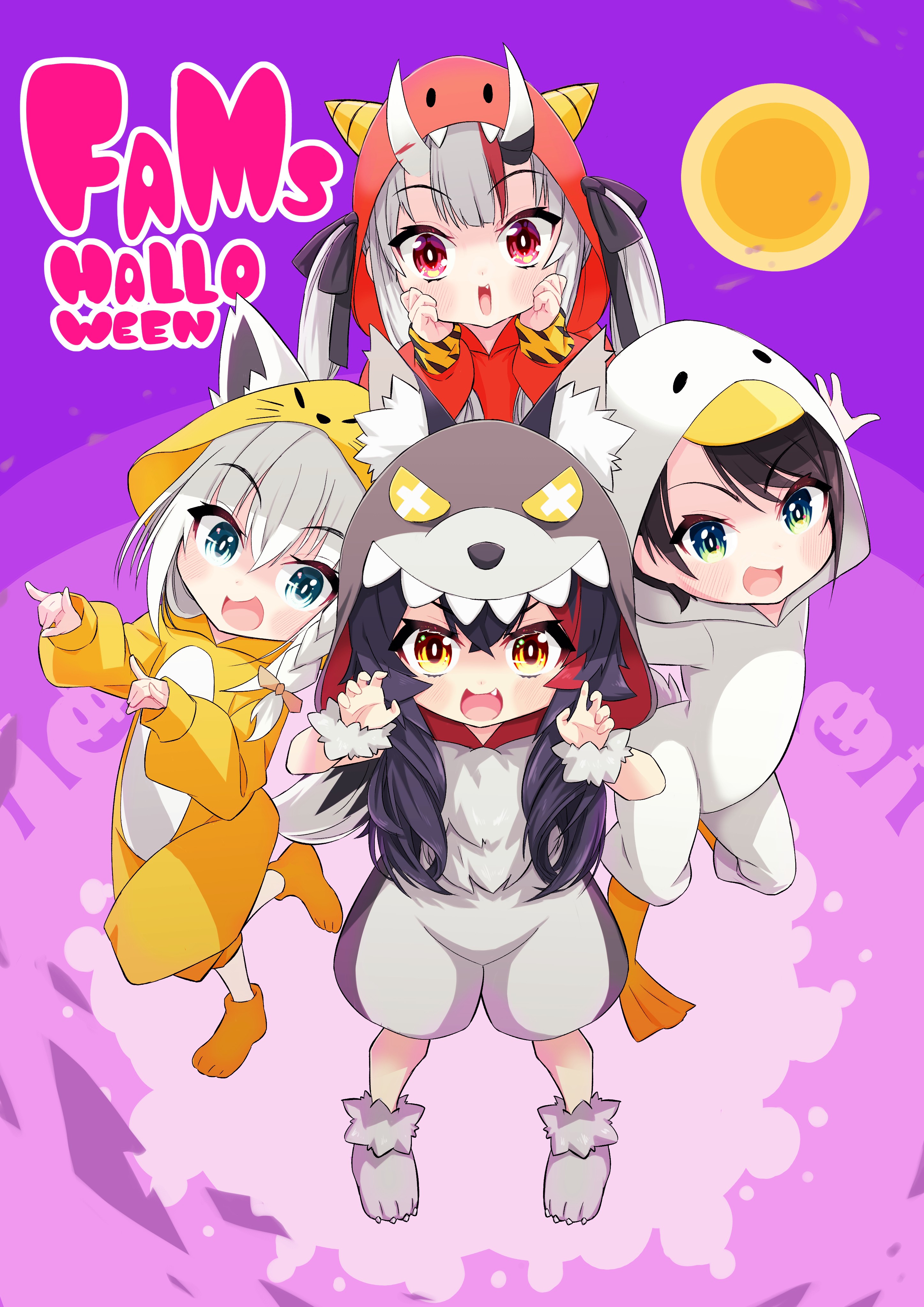 4girls :d absurdres aged_down animal_hood black_hair blush brown_hair chibi claw_pose duck_hood fams_(group) fang fox_hood grey_hair halloween highres hololive hood looking_at_viewer multiple_girls nakiri_ayame onesie ookami_mio oozora_subaru open_mouth shirakami_fubuki smile v-shaped_eyebrows virtual_youtuber wappa wolf_hood