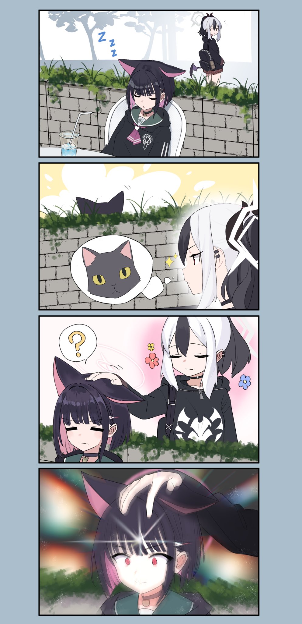2girls 4koma ? aji_aji_nori animal_ears black_hair blue_archive cat_ears closed_eyes colored_inner_hair comic cup demon_horns disposable_cup extra_ears halo headpat highres horns imagining intentionally_missing_halo kayoko_(blue_archive) kazusa_(blue_archive) looking_at_another meme missing_halo multicolored_hair multiple_girls outdoors pink_hair ponytail purple_hair school_uniform short_hair silent_comic sleeping space_cat_(meme) spoken_question_mark streaked_hair two-tone_hair white_hair wide-eyed zzz