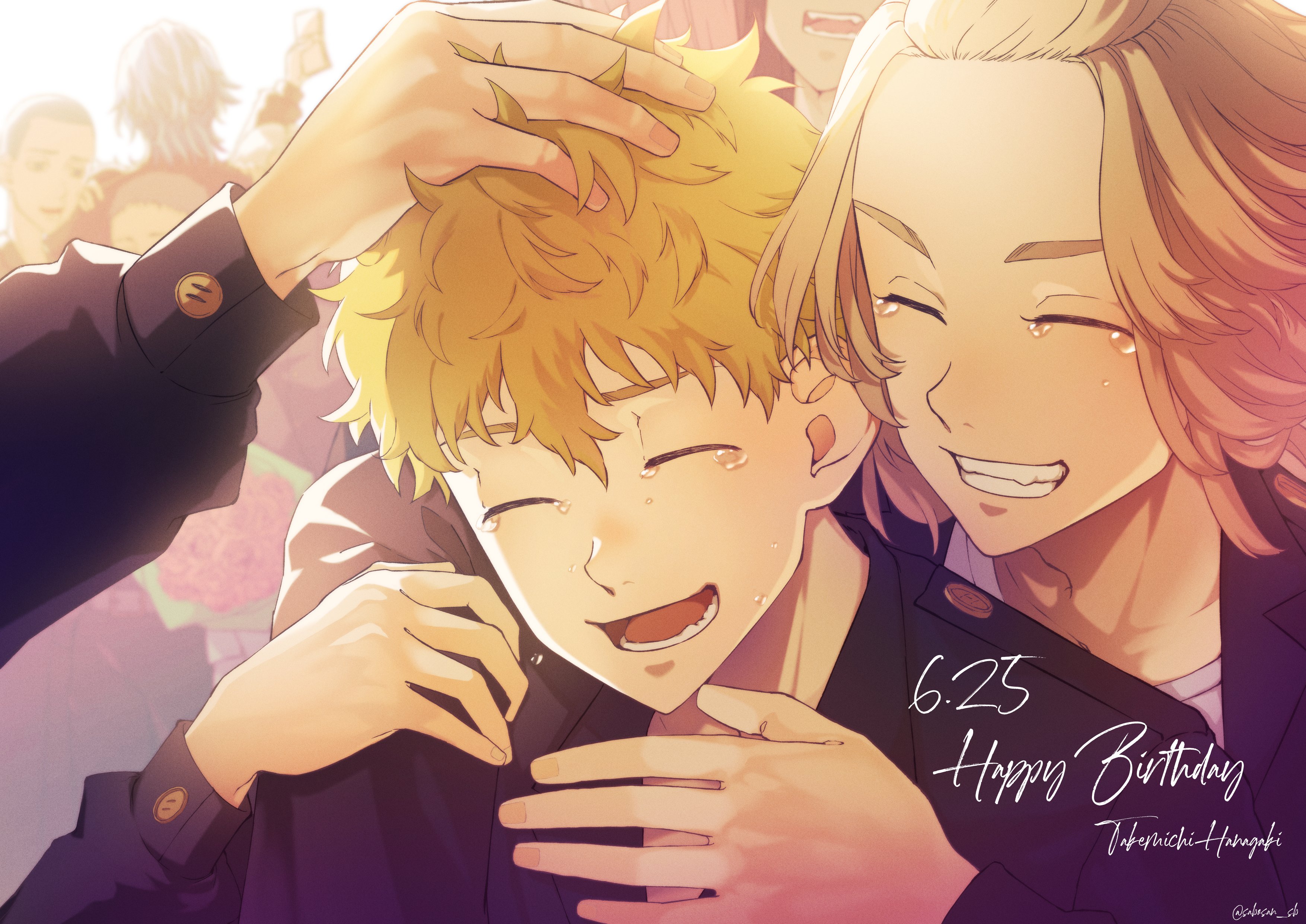 1other 5boys ^_^ absurdres arm_around_shoulder baji_keisuke black_jacket blonde_hair character_name closed_eyes dated grin hanagaki_takemichi hand_on_another's_head happy_birthday highres jacket male_focus multiple_boys open_mouth sabo_(sabosan_sb) sano_manjirou shiba_hakkai shiba_taiju shirt short_hair smile tearing_up teeth tokyo_revengers upper_body white_shirt