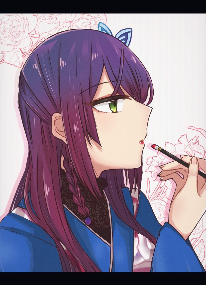 1girl applying_makeup applying_own_makeup assault_lily blue_kimono braid butterfly_hair_ornament commentary drop_shadow fingernails floral_background floral_print from_side funada_kiito green_eyes grey_background hair_ornament hand_up holding holding_brush japanese_clothes kimono letterboxed long_hair long_sleeves looking_ahead makeup_brush nigari_(ngari_0115) official_alternate_costume official_alternate_hairstyle parted_lips print_kimono profile purple_hair side_braid sidelocks single_braid solo untranslatable_commentary upper_body wide_sleeves