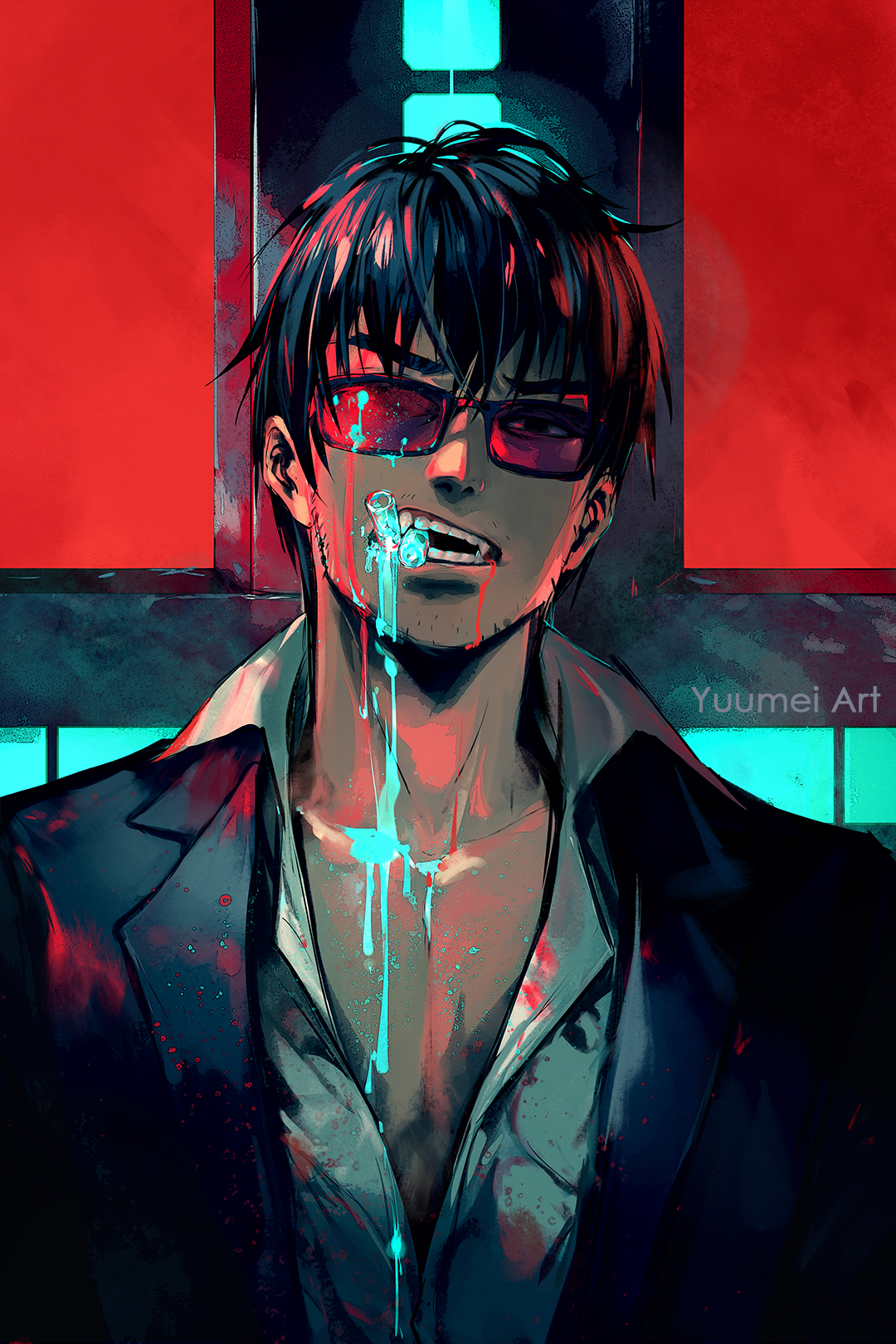 1boy artist_name black_hair black_jacket collarbone collared_shirt cross cross_punisher dripping facial_hair highres jacket large_cross looking_at_viewer male_focus mouth_hold nicholas_d._wolfwood open_mouth partially_unbuttoned red_background shirt short_hair solo sunglasses teeth teeth_hold trigun trigun_stampede upper_body v-shaped_eyebrows vial white_shirt yuumei