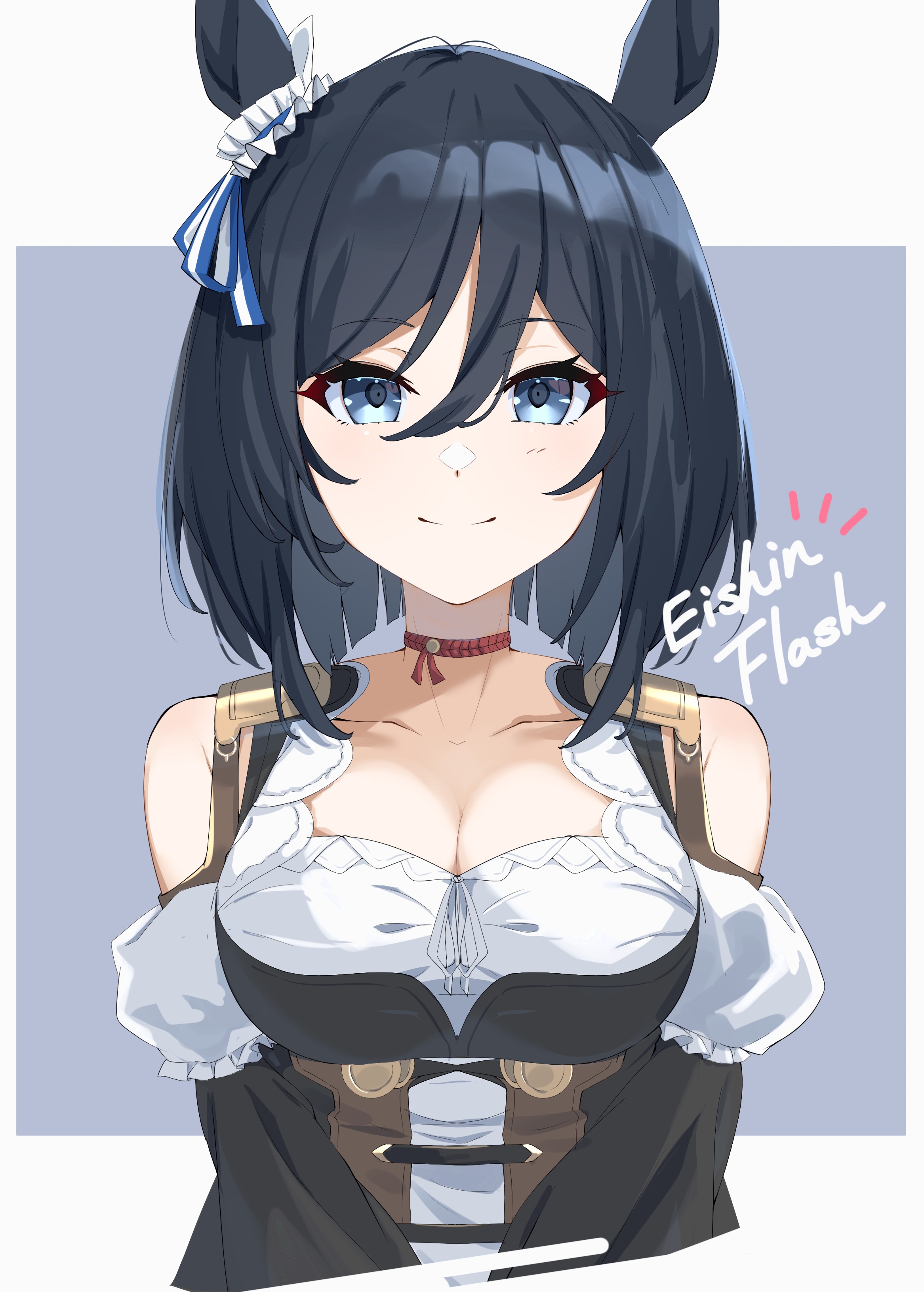 1girl absurdres animal_ears black_dress blue_eyes bob_cut breasts character_name cleavage collarbone detached_sleeves dress eishin_flash_(umamusume) frilled_dress frills german_clothes hair_between_eyes highres horse_ears horse_girl looking_at_viewer medium_breasts medium_hair puffy_sleeves shikaya smile solo swept_bangs umamusume upper_body