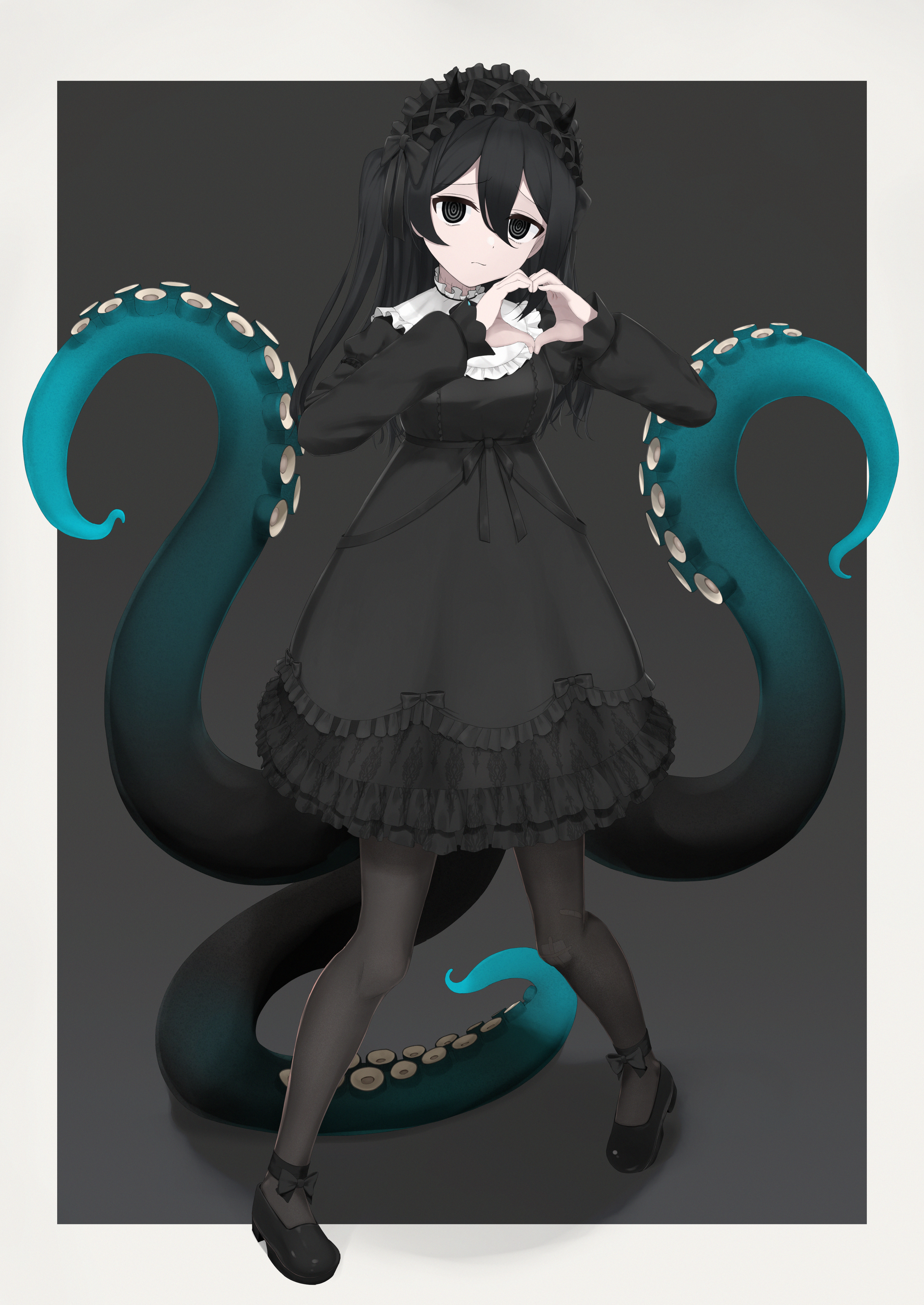 1girl absurdres ankle_bow ankle_ribbon black_background black_bow black_dress black_eyes black_hair black_hairband black_pantyhose border bow capelet commentary_request dress frilled_capelet frilled_dress frilled_hairband frills full_body furrowed_brow gothic_lolita hairband hands_up head_tilt heart heart_hands highres horns ichinose_rokujou indie_virtual_youtuber lolita_fashion long_hair long_sleeves looking_at_viewer mary_janes official_alternate_costume outside_border pantyhose pigeon-toed raised_eyebrows ribbon ringed_eyes shoes short_dress simple_background sleeve_garter solo standing stitched_neck stitches tentacles two_side_up virtual_youtuber waist_bow white_border white_capelet yamata_ia