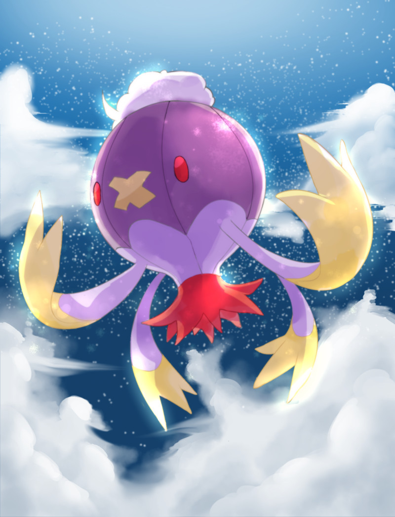 asakirirokuyu cloud commentary_request drifblim floating full_body gen_4_pokemon night nintendo no_humans outdoors pokemon pokemon_(creature) red_eyes sky solo star_(sky) starry_sky