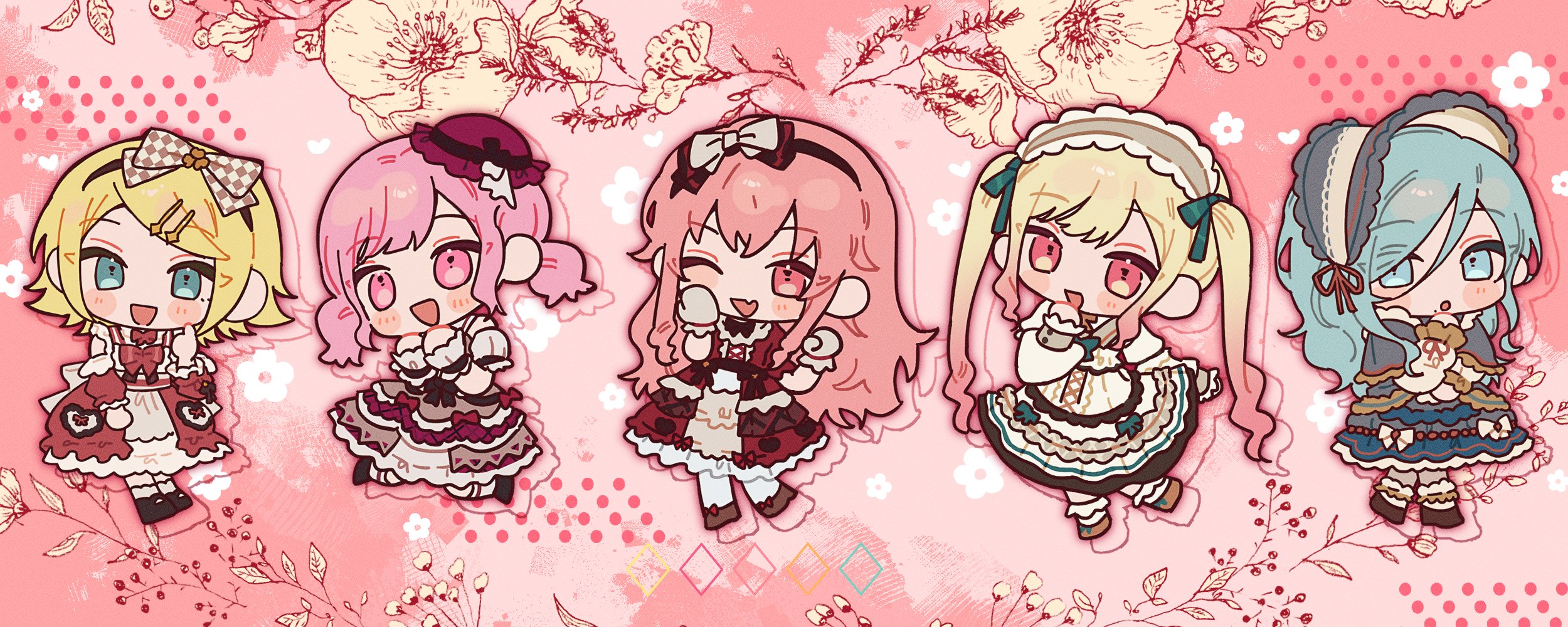 5girls aqua_bow aqua_eyes blonde_hair blue_capelet blue_dress blue_eyes blue_hair bow bowtie capelet checkered_bow checkered_clothes chibi dress gloves hair_bow hairband highres himitsu_no_valentine_daisakusen!_(project_sekai) hinomori_shizuku kagamine_rin keeta long_hair momoi_airi more_more_jump!_(project_sekai) more_more_jump!_rin multiple_girls ootori_emu pink_background pink_dress pink_eyes pink_hair project_sekai red_bow red_bowtie red_dress red_hairband short_twintails sidelocks tenma_saki twintails very_long_hair vocaloid white_dress white_gloves