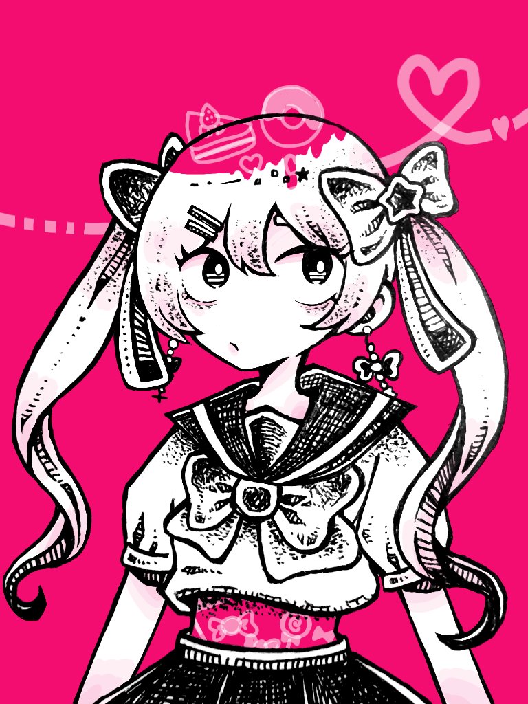 1girl blush candy closed_mouth co8 food hatsune_miku heart lollipop monochrome pink_background ribbon school_uniform short_twintails twintails vocaloid