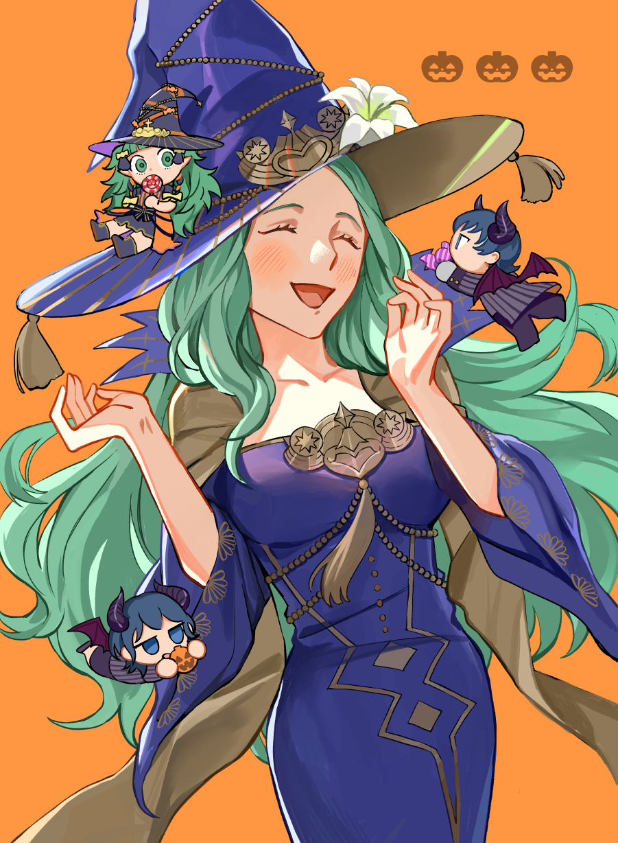 1boy 3girls female_byleth_(fire_emblem) male_byleth_(fire_emblem) male_byleth_(halloween)_(fire_emblem) candy chibi fire_emblem fire_emblem:_three_houses fire_emblem_heroes flower food green_eyes green_hair halloween halloween_costume hat highres jack-o'-lantern long_hair multiple_girls nintendo official_alternate_costume orange_background rhea_(fire_emblem) rhea_(halloween)_(fire_emblem) sawarame smile sothis_(fire_emblem) sothis_(halloween)_(fire_emblem) teeth upper_teeth_only white_flower witch witch_hat