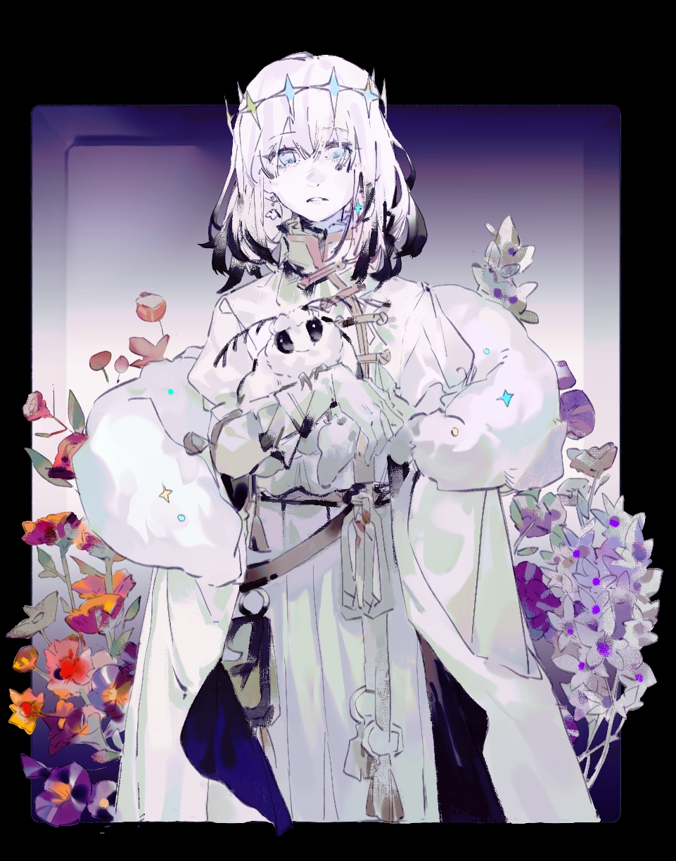 1boy arthropod_boy blanca_(fate) blue_eyes bug cloak cowboy_shot crown diamond_hairband fate/grand_order fate_(series) floral_background flower fur-trimmed_cloak fur_trim grey_hair highres insect long_sleeves looking_at_viewer male_focus medium_hair moth missing_wings oberon_(fate) oberon_(second_ascension)_(fate) solo tancang531 white_cloak