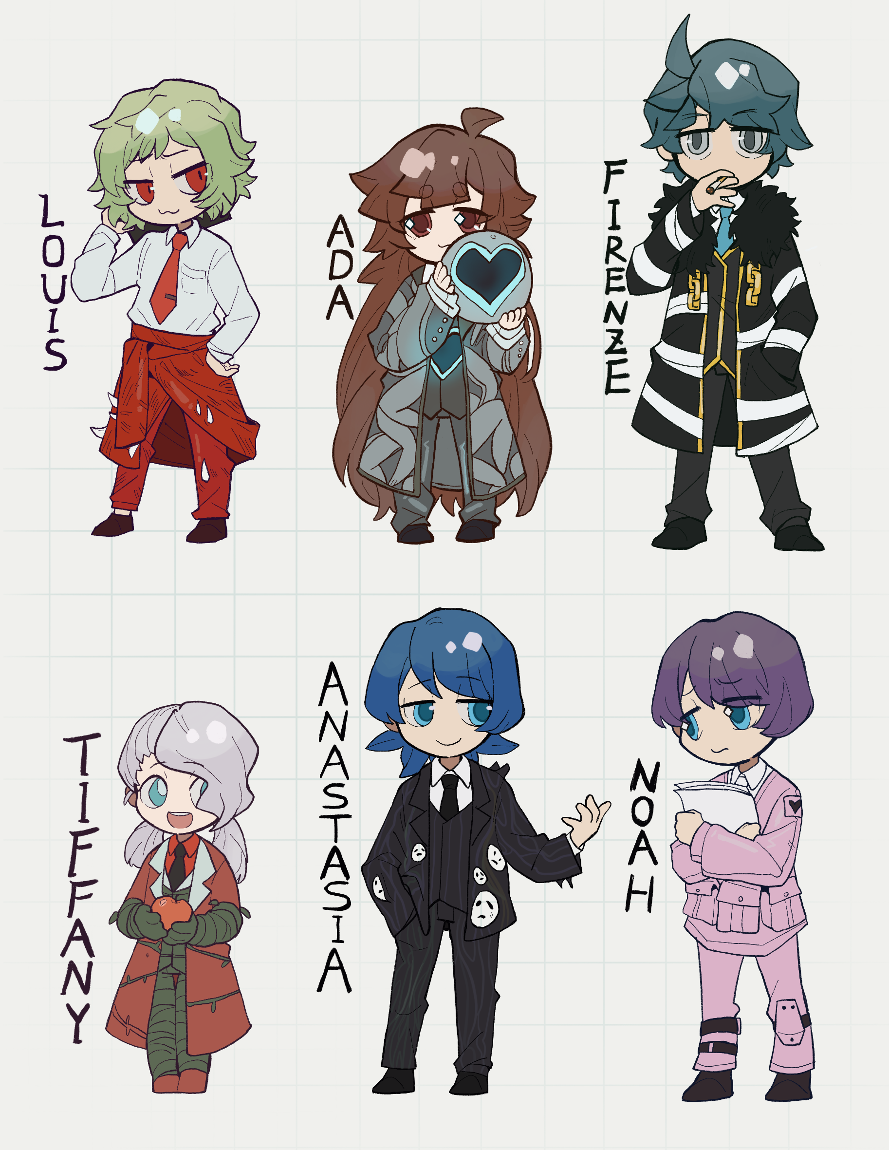 3boys 3girls :3 ahoge apple aqua_hair aqua_necktie black_coat black_jacket black_necktie black_pants black_vest blue_eyes blue_hair brown_eyes brown_hair chinese_commentary closed_mouth clothes_around_waist coat collared_shirt commentary_request e.g.o_(project_moon) employee_(project_moon) food fruit full_body green_hair green_stem_(e.g.o) grey_coat grey_eyes grey_pants grey_vest highres holding holding_food holding_fruit holding_orb holding_paper jacket jacket_around_waist justitia_(e.g.o) lobotomy_corporation long_hair long_sleeves mimicry_(e.g.o) multiple_boys multiple_girls necktie no_nose nugget_(project_moon) open_clothes open_coat open_jacket pants paper pink_(e.g.o) pink_jacket pink_pants project_moon purple_hair red_coat red_eyes red_jacket red_necktie red_pants red_shirt shirt short_hair sleeves_past_wrists smile smile_(e.g.o) sound_of_a_star_(e.g.o) teeth tesna tie_clip twintails upper_teeth_only very_long_hair vest white_hair white_necktie white_shirt