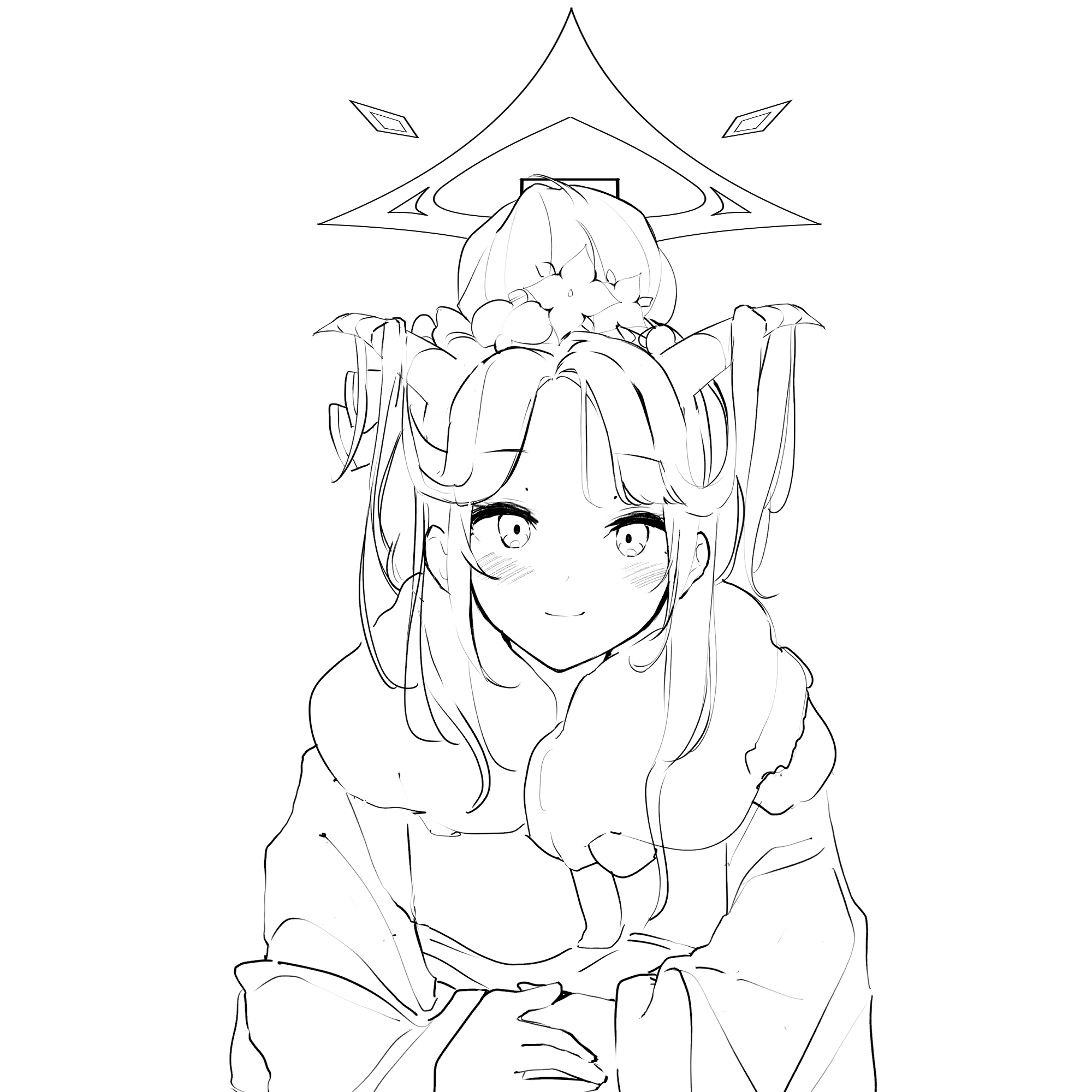 1girl blue_archive demon_horns fuuka_(blue_archive) fuuka_(new_year)_(blue_archive) glimer3048 halo highres horns japanese_clothes kimono looking_at_viewer official_alternate_costume official_alternate_hairstyle simple_background sketch solo white_background