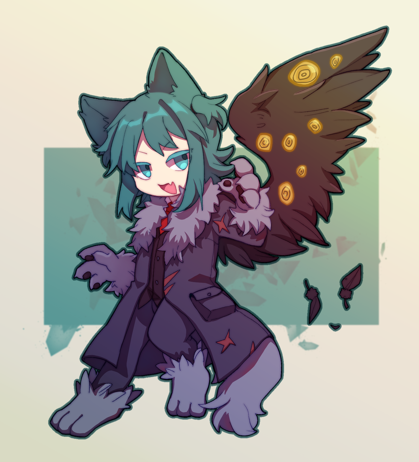 1girl animal_ears animal_hands aqua_hair black_feathers black_vest blue_eyes boots chinese_commentary coat cobalt_scar_(e.g.o) colored_eyelashes commentary_request e.g.o_(project_moon) employee_(project_moon) feathers fur-trimmed_coat fur_trim gloves grey_boots grey_coat grey_pants highres lobotomy_corporation necktie no_nose nugget_(project_moon) open_mouth pants paw_gloves paw_shoes project_moon red_necktie single_wing smile solo tail tesna twilight_(e.g.o) vest wings wolf_ears wolf_girl wolf_tail