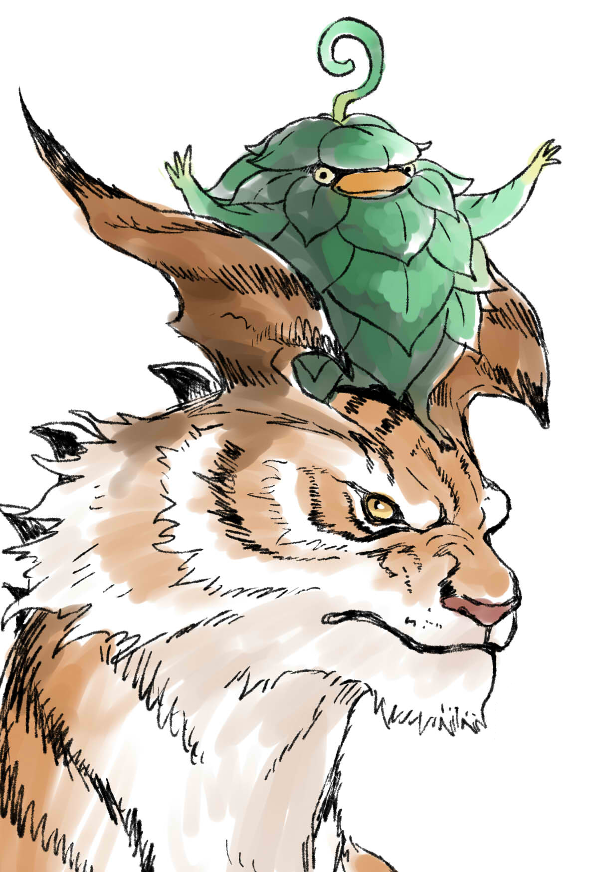 arms_up black_fur closed_mouth creature creature_on_head darrcuiln final_fantasy final_fantasy_xi highres leaf leafkin multicolored_fur no_humans orange_fur saginada simple_background smile spikes striped_fur tiger white_background white_fur yellow_eyes