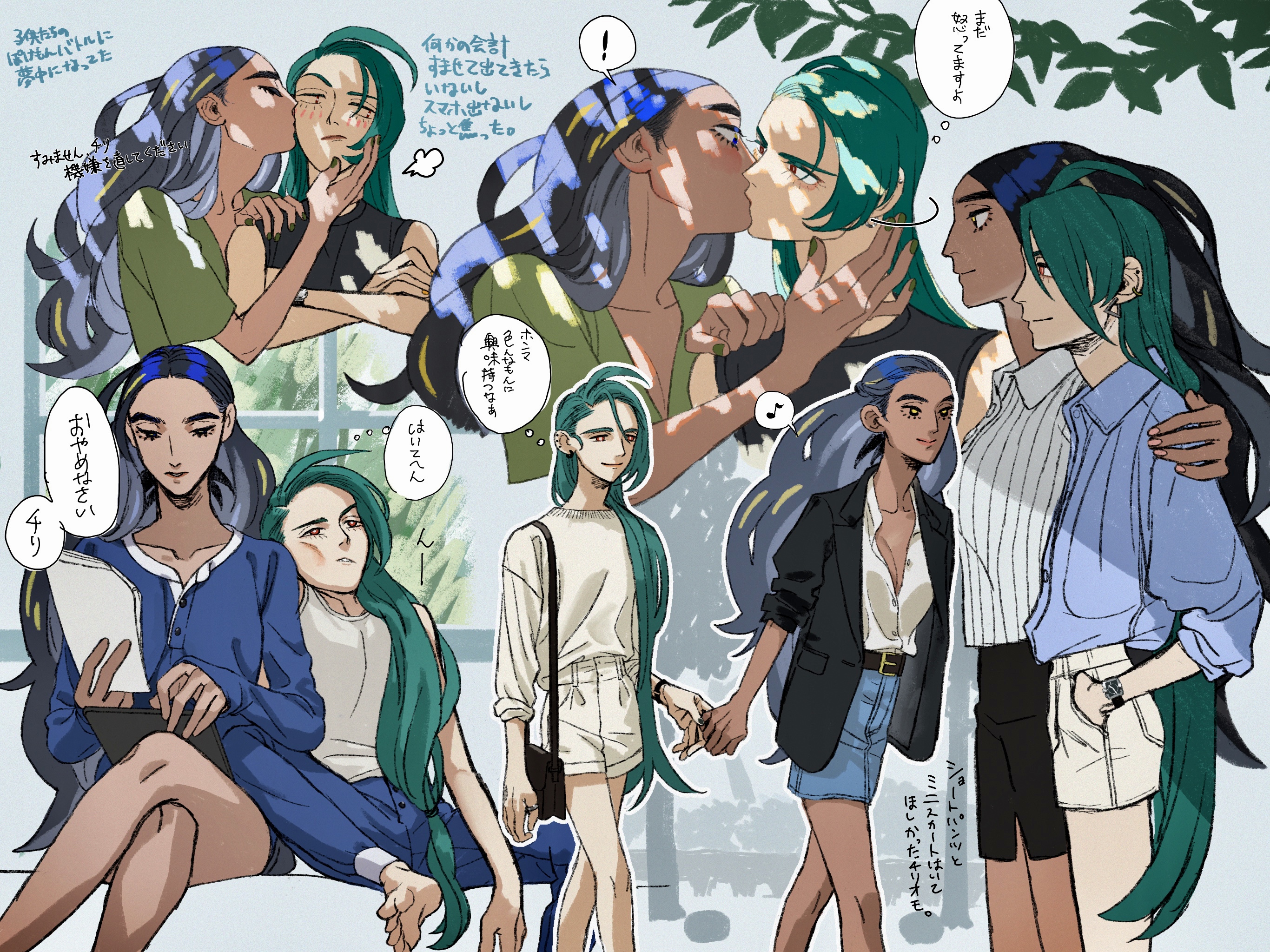 2girls bag barefoot belt black_hair black_jacket blonde_hair blue_hair bright_pupils dark-skinned_female dark_skin geeta_(pokemon) green_hair handbag highres jacket kurage_(huwahuwaru_n) long_hair long_sleeves multicolored_hair multiple_girls multiple_views musical_note nintendo partially_unbuttoned pokemon pokemon_scarlet_and_violet ponytail rika_(pokemon) shorts side_ponytail sitting smile speech_bubble spoken_musical_note thought_bubble unbuttoned unbuttoned_shirt very_long_hair white_pupils yuri