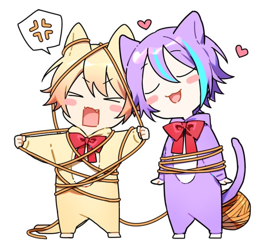 >_< 2boys anger_vein animal_ears aqua_hair blonde_hair blush bow bowtie cat_ears cat_tail closed_eyes commentary double-parted_bangs fang full_body gradient_hair hair_between_eyes heart hk_(wgyz7222) kamishiro_rui male_focus multicolored_hair multiple_boys onesie open_mouth orange_hair project_sekai purple_hair red_bow red_bowtie short_hair spoken_anger_vein standing streaked_hair tail tenma_tsukasa two-tone_hair yarn