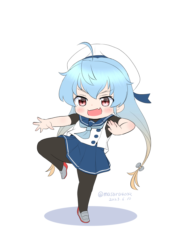 1girl ahoge black_pantyhose blonde_hair blue_hair blue_neckerchief blue_sailor_collar blue_skirt dated fang fighting_stance full_body gloves gradient_hair hat kantai_collection long_hair masara_(chuujou) multicolored_hair neckerchief one-hour_drawing_challenge pantyhose pleated_skirt red_eyes sado_(kancolle) sailor_collar sailor_hat school_uniform serafuku shirt simple_background skin_fang skirt sleeveless sleeveless_shirt solo standing standing_on_one_leg twitter_username undershirt white_background white_gloves white_hat