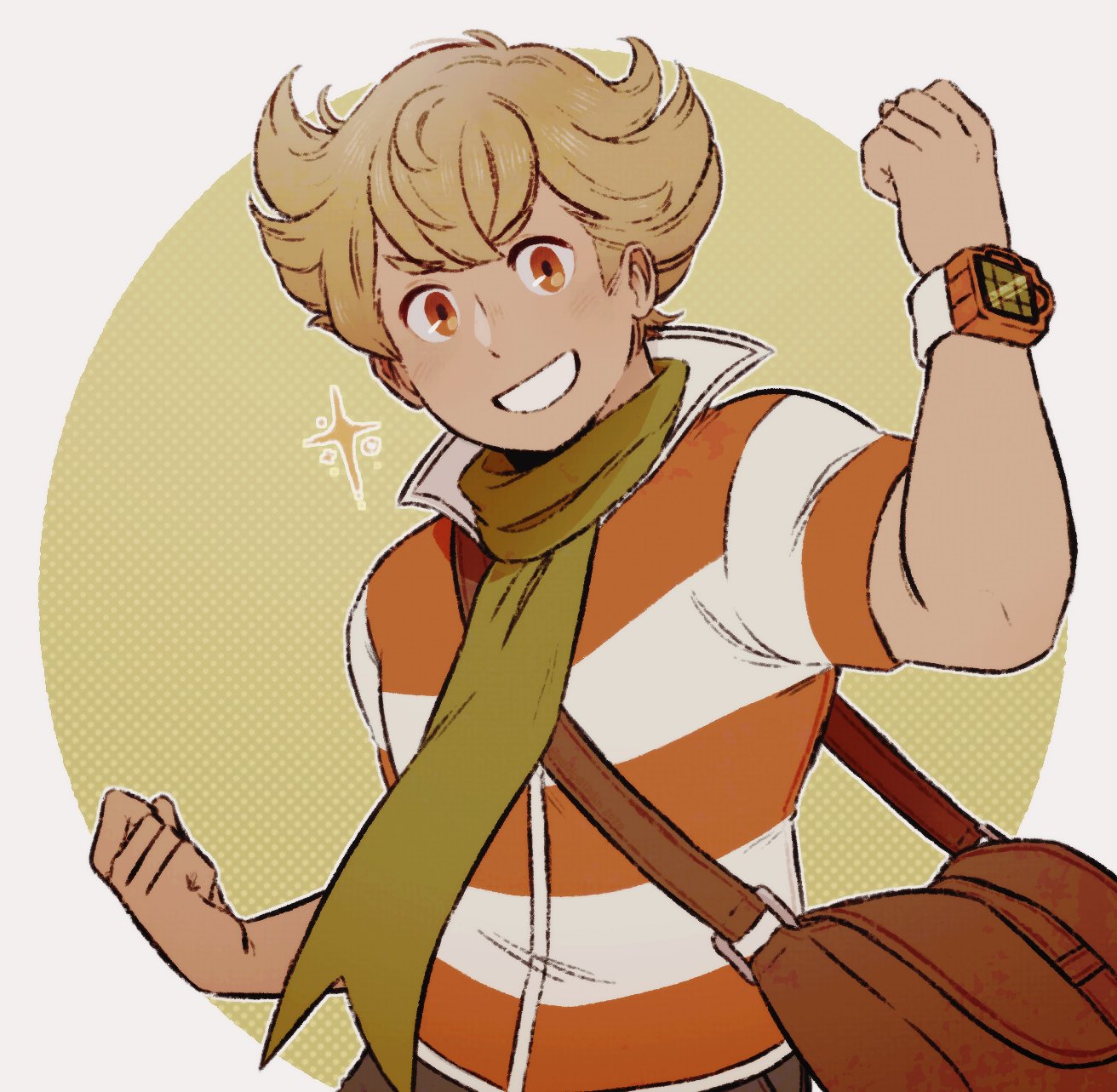 1boy arm_up bag barry_(pokemon) blonde_hair brown_bag clenched_hands commentary green_background green_scarf grin highres jacket looking_at_viewer male_focus nintendo orange_eyes petalpaladin pokemon pokemon_diamond/pearl/platinum poketch scarf short_hair short_sleeves shoulder_bag smile solo striped_clothes striped_jacket teeth upper_body watch wristwatch