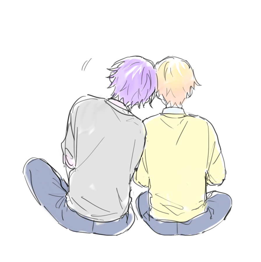 2boys back blonde_hair blue_pants commentary gradient_hair hk_(wgyz7222) kamishiro_rui kamiyama_high_school_uniform_(project_sekai) leaning_on_person long_hair male_focus multicolored_hair multiple_boys orange_hair pants project_sekai purple_hair school_uniform short_sleeves simple_background sitting tenma_tsukasa very_long_hair white_background yaoi