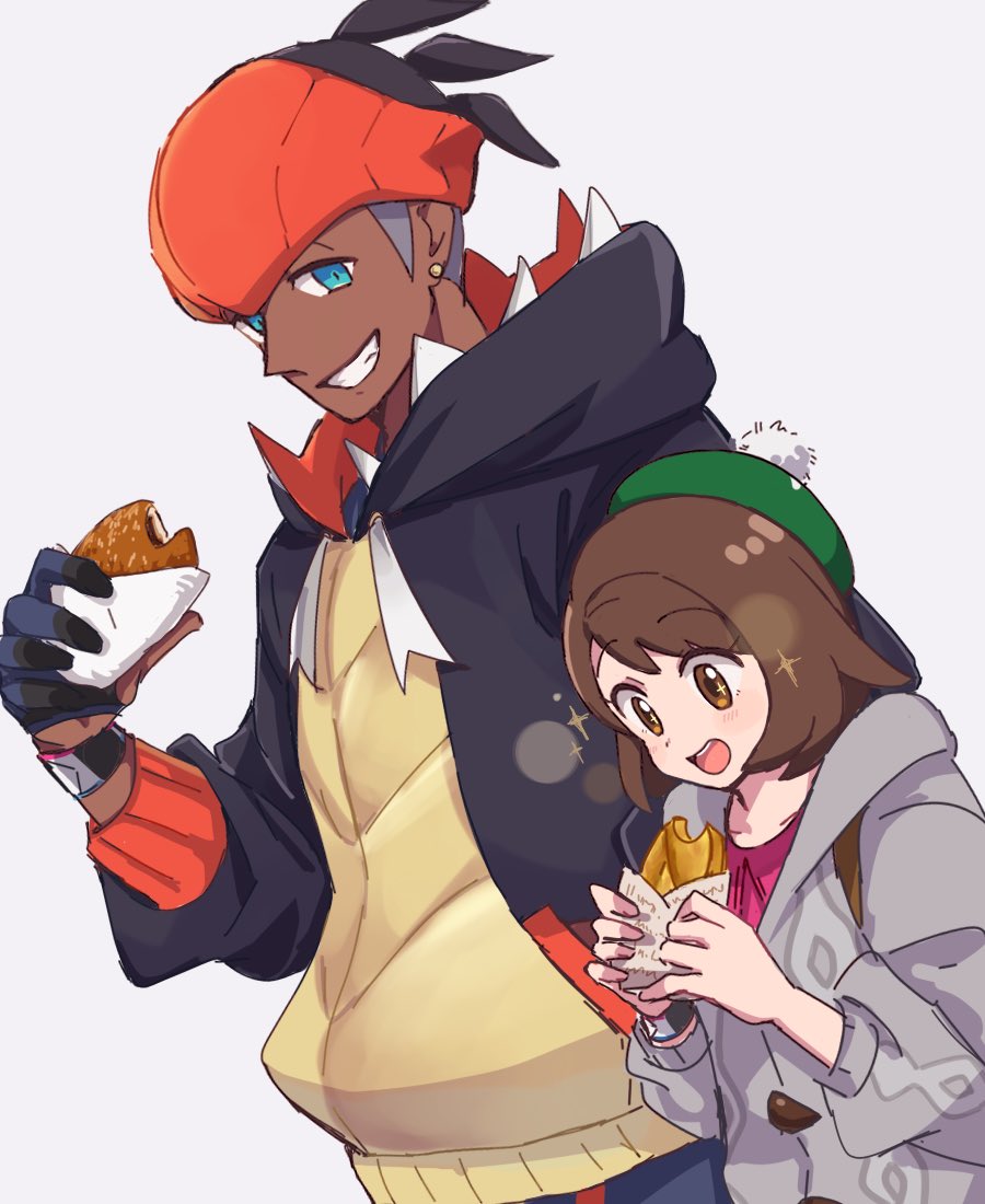 1boy 1girl :d aqua_eyes black_hair black_hoodie blush bob_cut brown_eyes brown_hair cable_knit cardigan collared_dress commentary_request dark-skinned_male dark_skin dress dynamax_band earrings food gloria_(pokemon) gloves green_headwear grey_cardigan grin hat headband holding hood hooded_cardigan hoodie jewelry nintendo nm222 open_mouth orange_headband partially_fingerless_gloves pink_dress pokemon pokemon_sword_and_shield raihan_(pokemon) short_hair simple_background smile sparkle sparkling_eyes tam_o'_shanter teeth undercut upper_teeth_only white_background