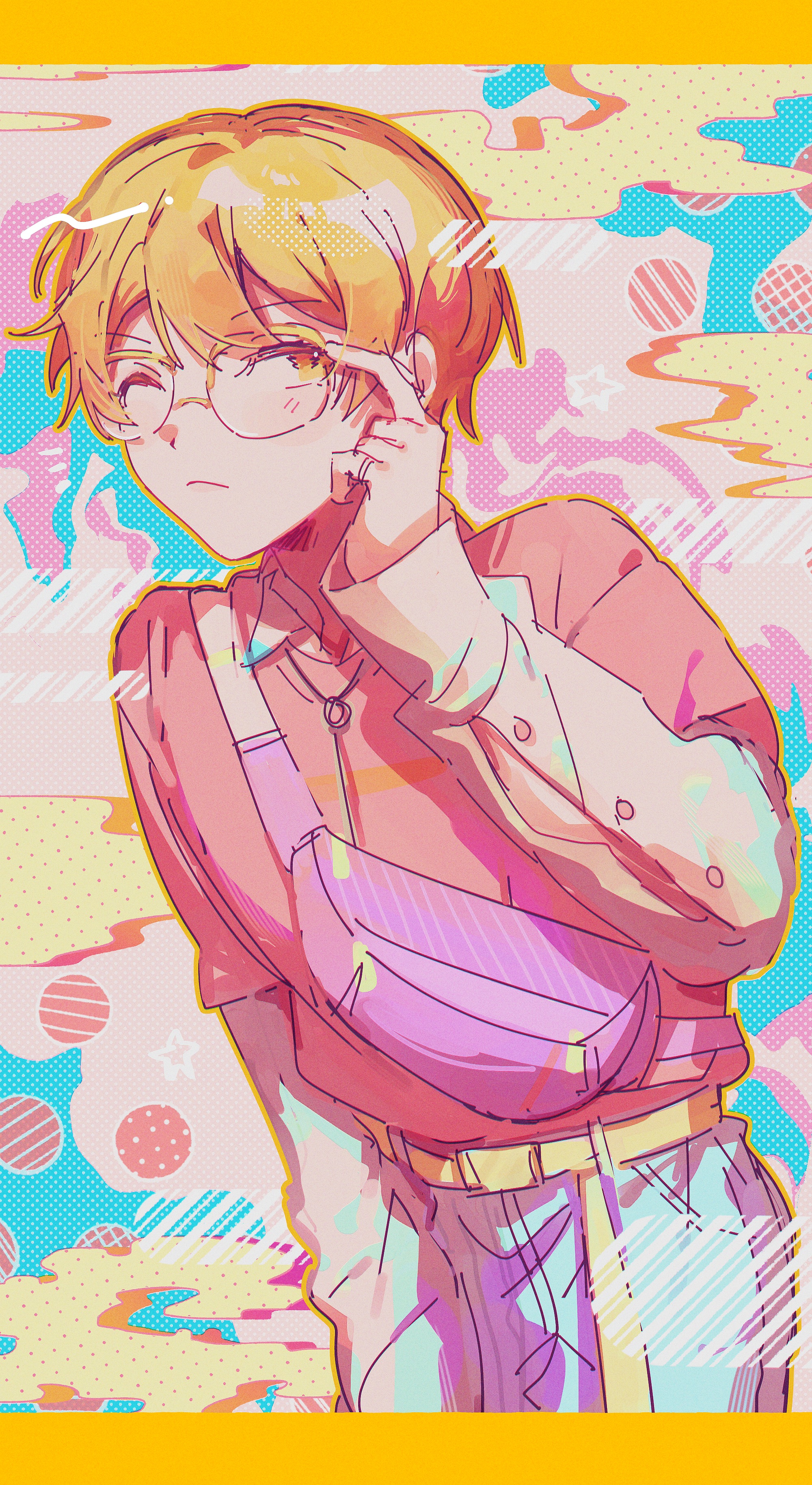1boy abstract_background absurdres adjusting_eyewear arm_at_side belt bespectacled blonde_hair blue_background blue_pants buttons casual circle closed_mouth cloud collared_shirt commentary cowboy_shot diagonal_stripes dotted_background double-parted_bangs fanny_pack frown glasses gradient_eyes grid highres jewelry keeta letterboxed long_sleeves looking_at_viewer male_focus multicolored_background multicolored_eyes multicolored_hair necklace notice_lines one_eye_closed orange_eyes orange_hair orange_shirt outline over-rim_eyewear pants pastel_colors pink_background pink_bag project_sekai screentones semi-rimless_eyewear shirt short_hair sketch solo striped_background t-shirt tenma_tsukasa white_shirt yellow-framed_eyewear yellow_background yellow_belt yellow_eyes yellow_outline