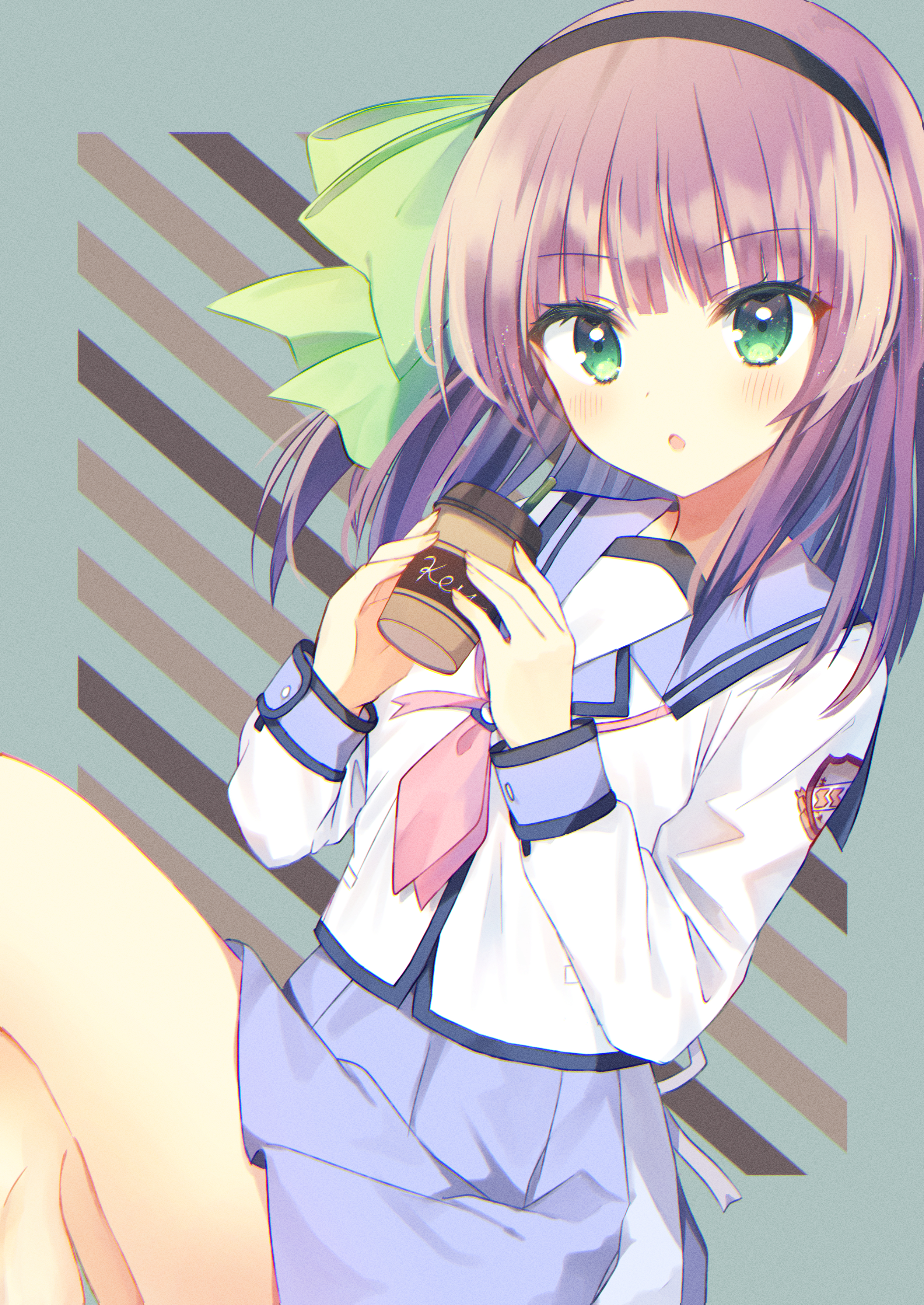 1girl :o absurdres aiyan angel_beats! black_hairband blue_sailor_collar blue_skirt blunt_bangs blush bow commentary_request company_name crossed_legs cup drinking_straw dutch_angle eyelashes eyes_visible_through_hair fingernails floating_hair green_background green_bow green_eyes hair_bow hair_over_shoulder hairband hands_up head_tilt highres holding holding_cup leaning_back long_hair long_sleeves looking_at_viewer miniskirt nakamura_yuri neckerchief open_mouth pink_neckerchief pleated_skirt purple_eyes sailor_collar school_uniform serafuku shinda_sekai_sensen_uniform shirt simple_background sitting skirt solo white_shirt