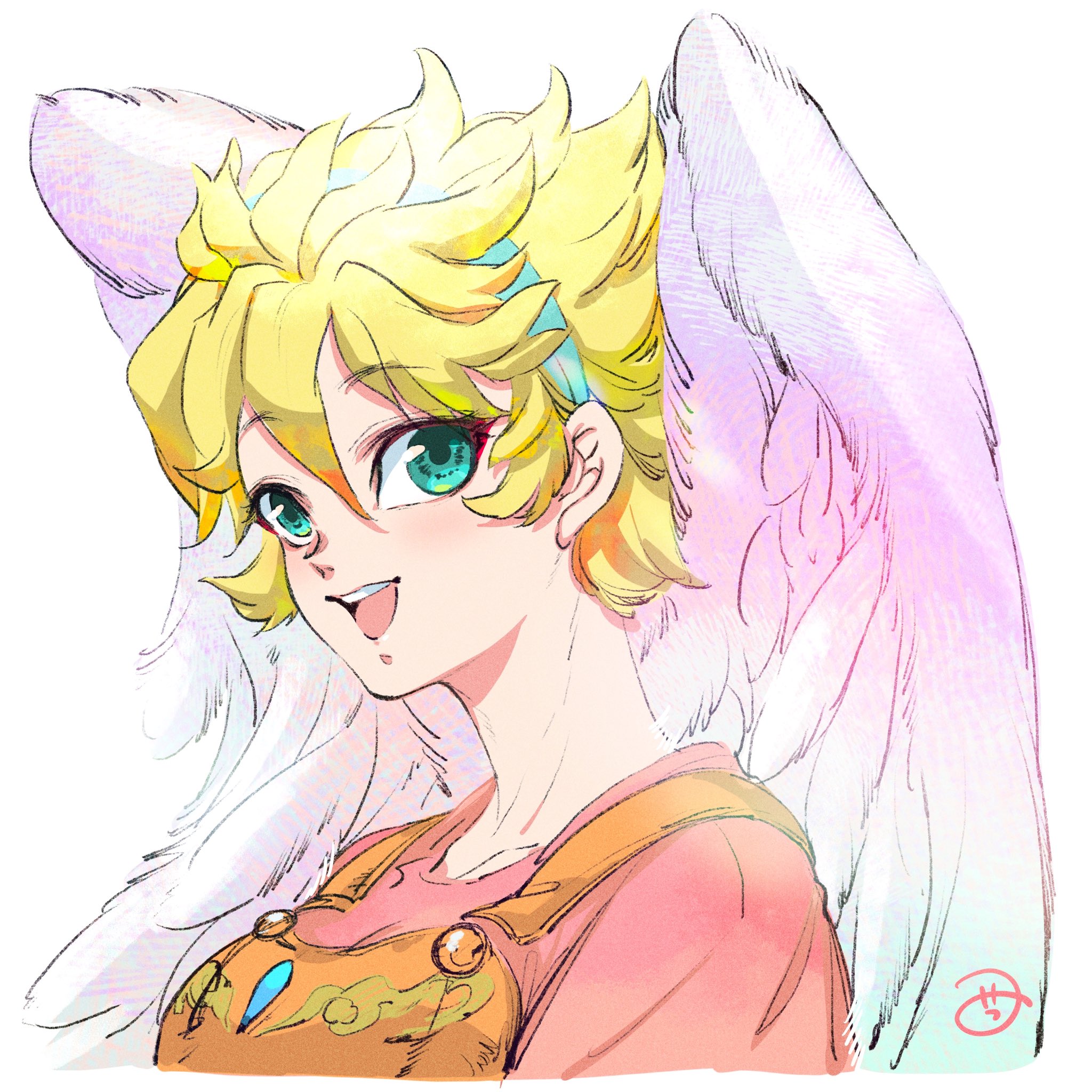 1girl angel_wings anzuni_(marblefrog) aqua_headband armor blonde_hair blue_eyes breath_of_fire breath_of_fire_i feathered_wings gloves green_eyes hairband headband highres looking_at_viewer nina_(breath_of_fire_i) open_mouth profile short_hair sidelocks simple_background smile solo white_background white_wings wings