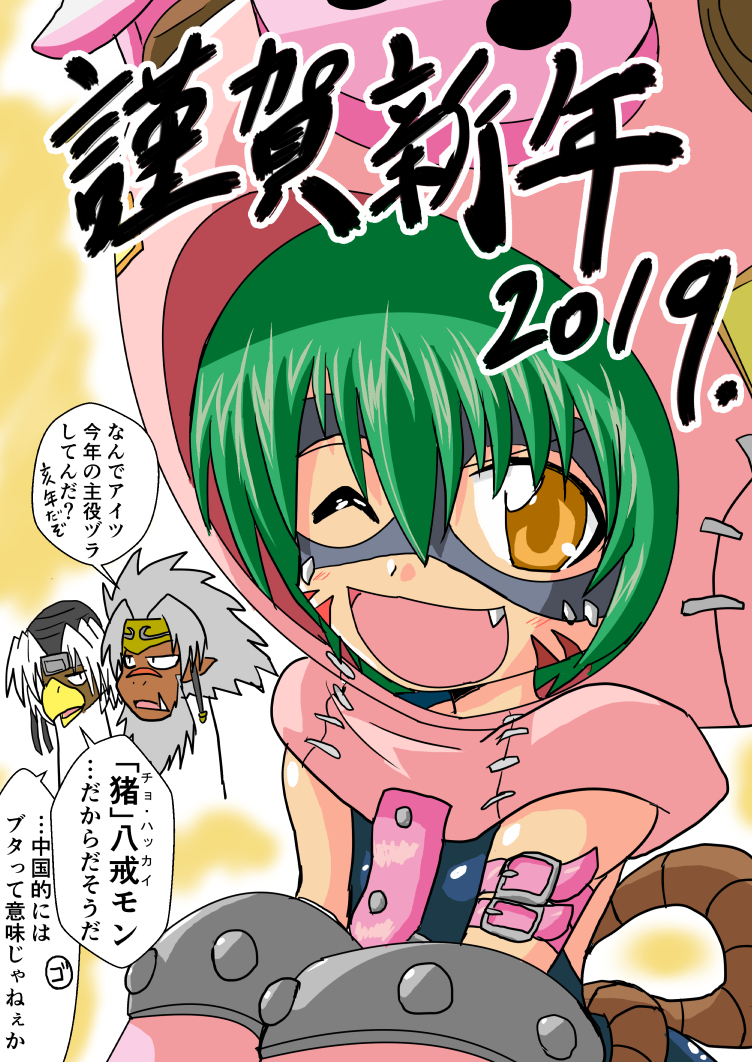 1girl 2boys belt cho-hakkaimon costume digimon digimon_(creature) gokuwmon monkey multiple_boys pig sagomon translation_request