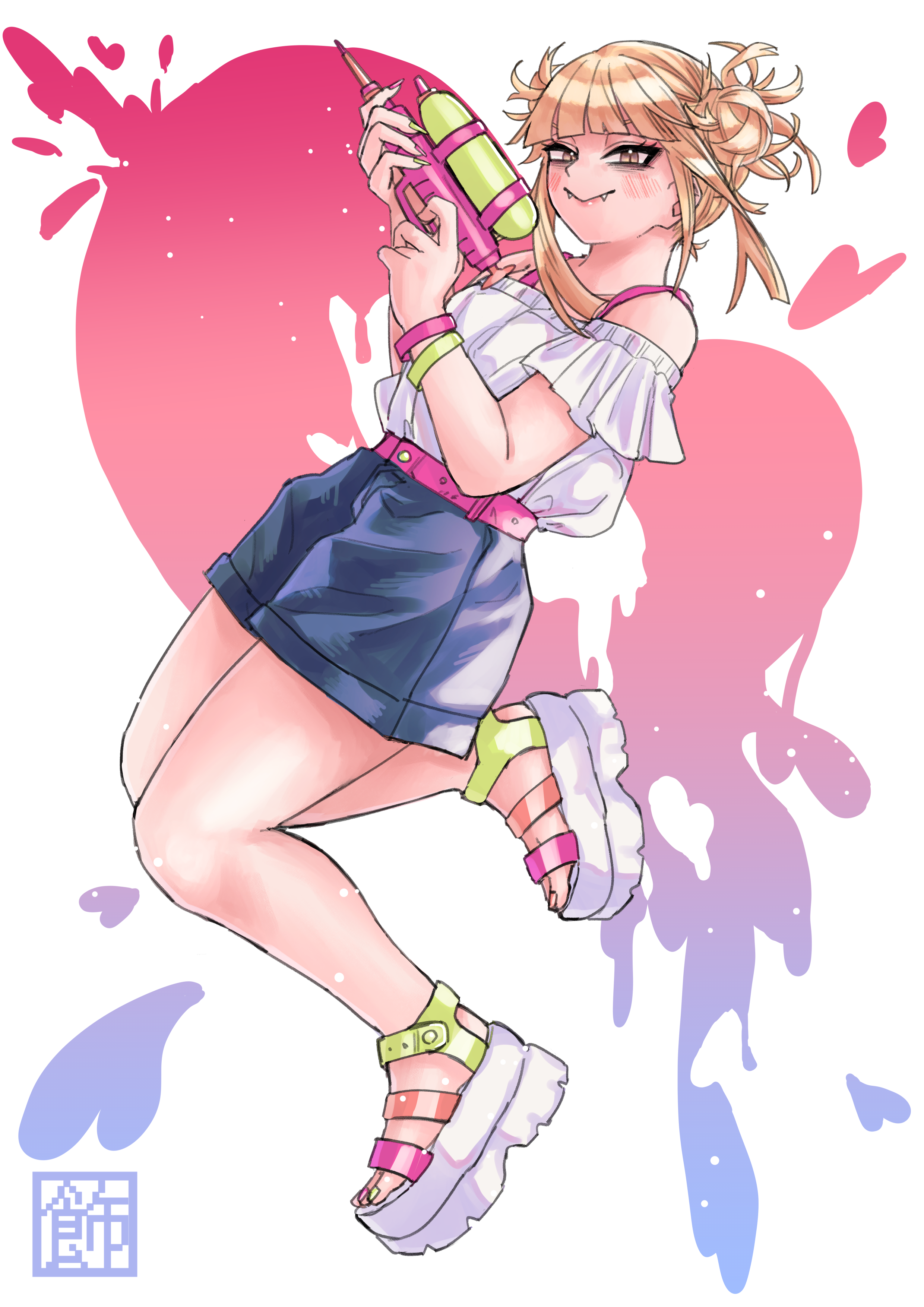 1girl :> absurdres belt blonde_hair blunt_bangs boku_no_hero_academia bracelet brown_eyes double_bun hair_bun highres jewelry kazari_kabocya messy_hair shorts sidelocks slit_pupils solo toga_himiko