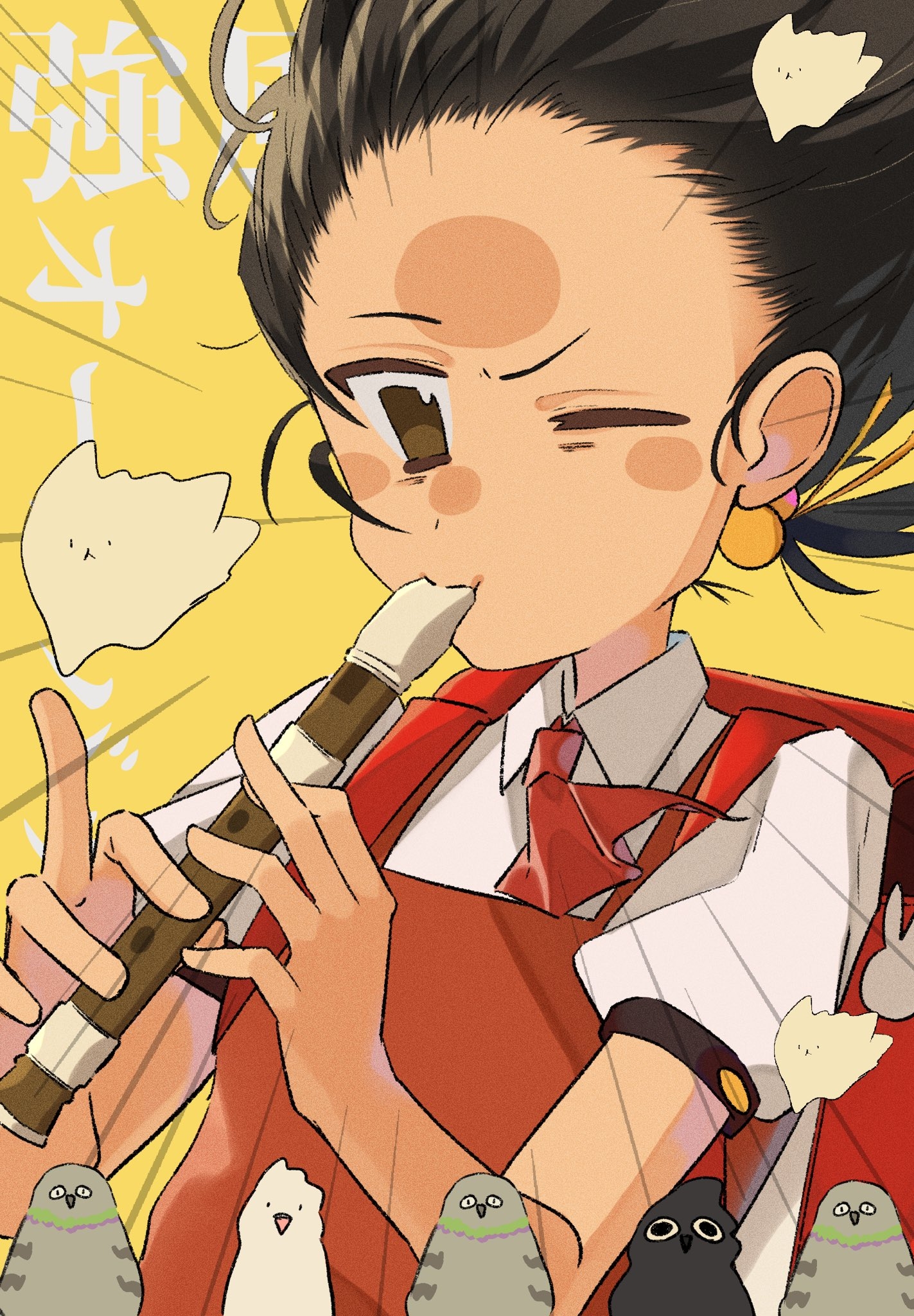 1girl animal ascot backpack bag bag_charm bird black_hair blush_stickers brown_eyes charm_(object) collared_shirt commentary_request crow dress emphasis_lines floating_hair flute forehead furrowed_brow hair_bobbles hair_ornament hands_up highres holding holding_flute holding_instrument instrument kaai_yuki kyoufuu_all_back_(vocaloid) looking_down low_twintails music one_eye_closed pigeon pinafore_dress playing_instrument puffy_short_sleeves puffy_sleeves raised_eyebrow randoseru recorder red_ascot red_bag red_dress shirt short_hair short_sleeves simple_background sleeveless sleeveless_dress solo song_name towagani translation_request twintails two-handed upper_body vocaloid white_shirt wind yellow_background