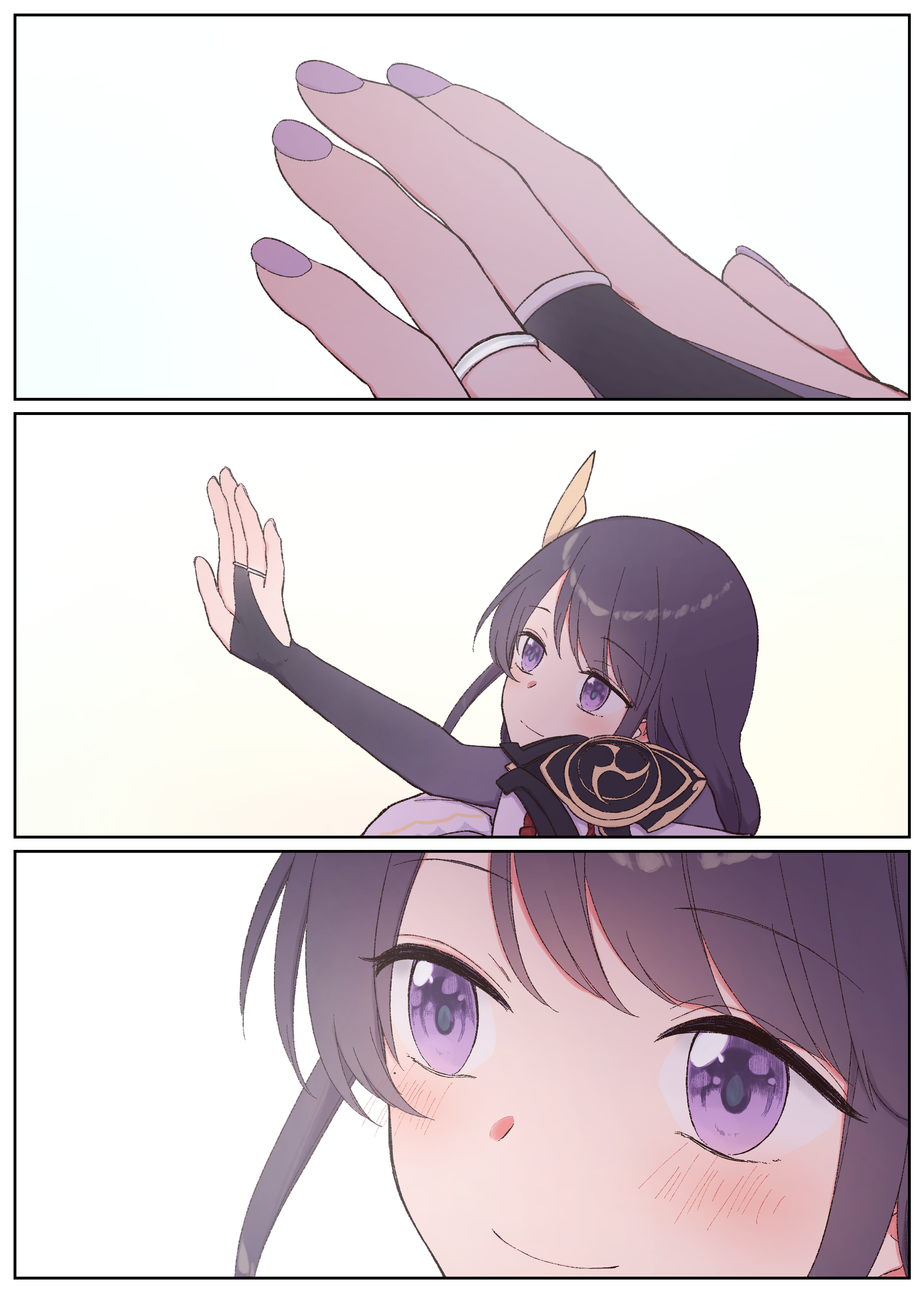 1girl 3koma absurdres arm_up blush bridal_gauntlets closed_mouth comic commentary_request genshin_impact hair_ornament highres jewelry looking_at_hand mole mole_under_eye multiple_rings nail_polish pic_postcard purple_eyes purple_hair purple_nails raiden_shogun ring smile solo