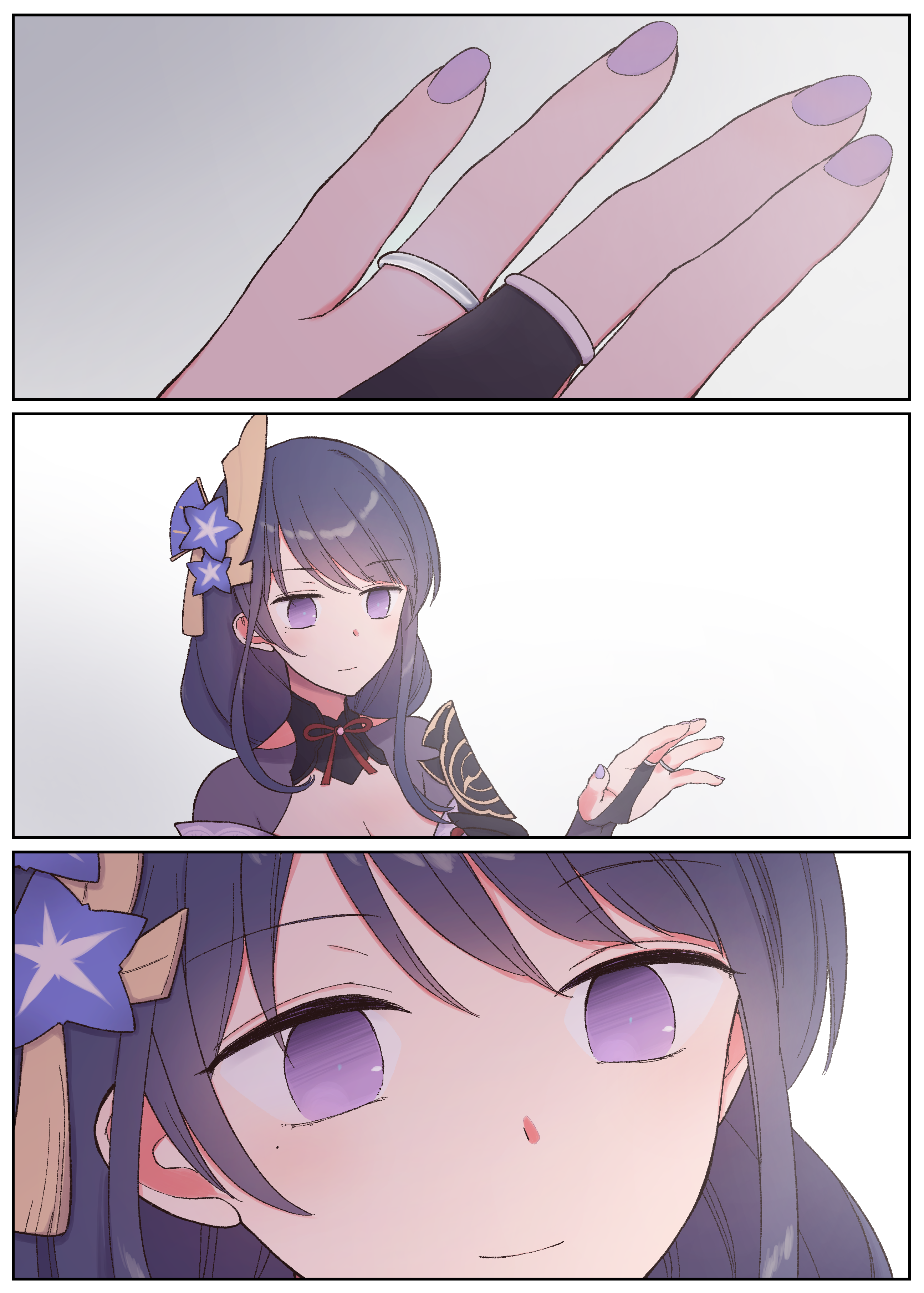1girl 3koma absurdres bridal_gauntlets closed_mouth comic commentary_request flower genshin_impact hair_flower hair_ornament highres jewelry mole mole_under_eye multiple_rings nail_polish no_pupils pic_postcard purple_eyes purple_flower purple_hair purple_nails raiden_shogun ring smile solo