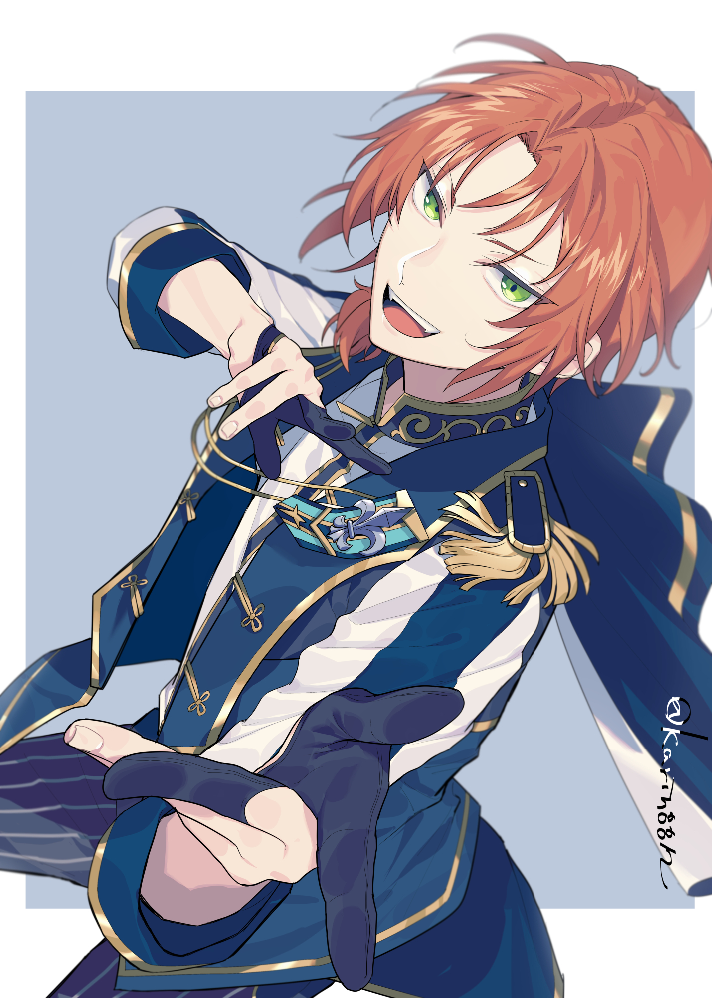 1boy border commentary_request cowboy_shot elbow_gloves ensemble_stars! epaulettes fingernails gloves green_eyes high_collar highres long_hair long_sleeves looking_at_viewer male_focus open_mouth orange_hair outside_border pants partial_commentary partially_fingerless_gloves pov single_epaulette three-quarter_sleeves sohu solo striped_clothes striped_pants teeth tsukinaga_leo twitter_username two-tone_background upper_teeth_only vertical-striped_clothes vertical-striped_pants voice_of_sword_(ensemble_stars!) white_border