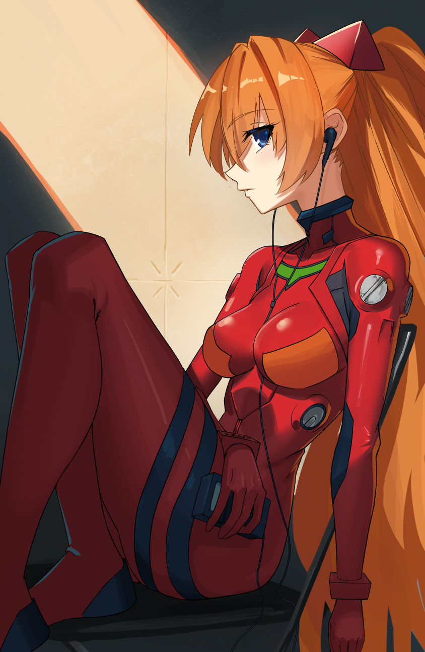 1girl ass blue_eyes bodysuit breasts brown_hair cassette_player expressionless gloves hair_ornament highres legs_together long_hair looking_at_viewer looking_to_the_side mecha_pilot_suit medium_breasts neon_genesis_evangelion nstch_root_a plugsuit_(evangelion) red_bodysuit simple_background sitting skin_tight solo souryuu_asuka_langley wide_hips