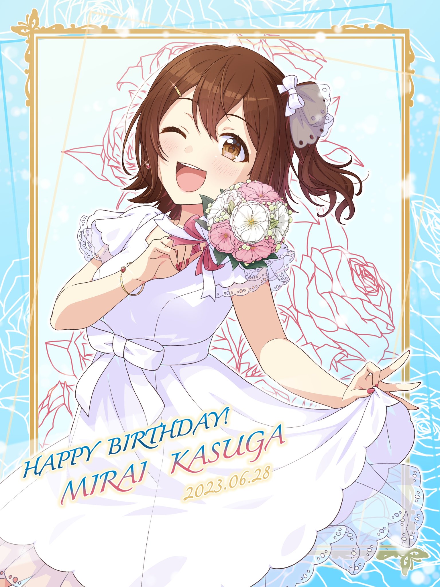 1girl bouquet bow brown_eyes brown_hair character_name dated dress dress_bow flower hair_ornament hairclip happy_birthday highres holding_own_dress idolmaster idolmaster_million_live! kasuga_mirai lace lace-trimmed_dress lace_trim one_eye_closed one_side_up open_mouth pink_nails shiro_(ongrokm) short_hair smile solo white_bow white_dress