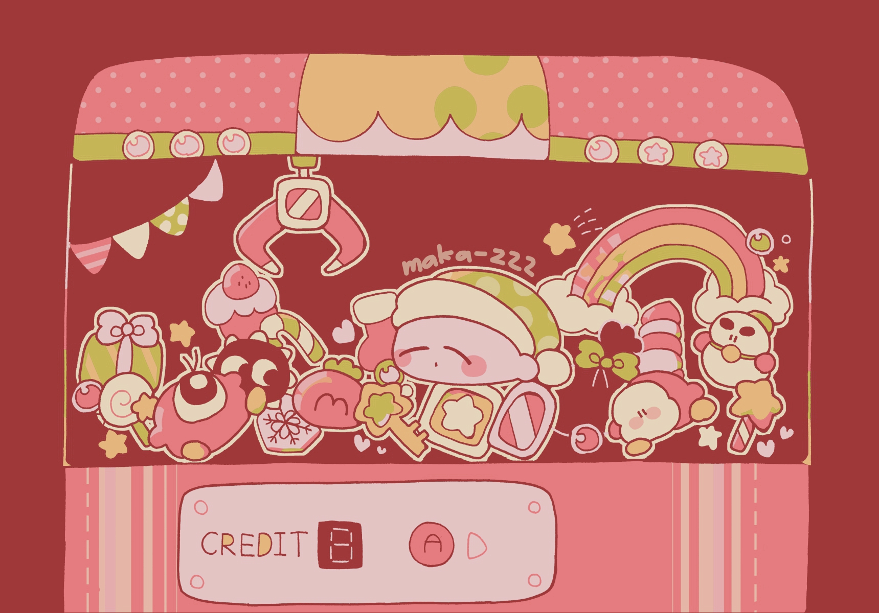 artist_name box candy candy_cane chilly_(kirby) closed_eyes crane_game cupcake food freezie gift gift_box gordo green_headwear hat heart highres key kirby kirby's_dream_land kirby_(series) lollipop maka-zzz maxim_tomato nightcap nintendo no_humans oro_(kirby) rainbow red_background sleeping star_rod string_of_flags swirl_lollipop waddle_dee waddle_doo