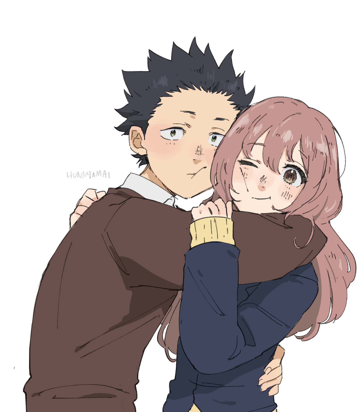 1boy 1girl black_eyes black_hair blue_jacket brown_eyes brown_hair brown_jacket cheek-to-cheek closed_mouth collared_shirt heads_together highres hug hunnyamai ishida_shouya jacket koe_no_katachi long_hair long_sleeves looking_at_viewer nishimiya_shouko one_eye_closed school_uniform shirt short_hair simple_background smile solo spiked_hair sweater white_background white_shirt yellow_sweater