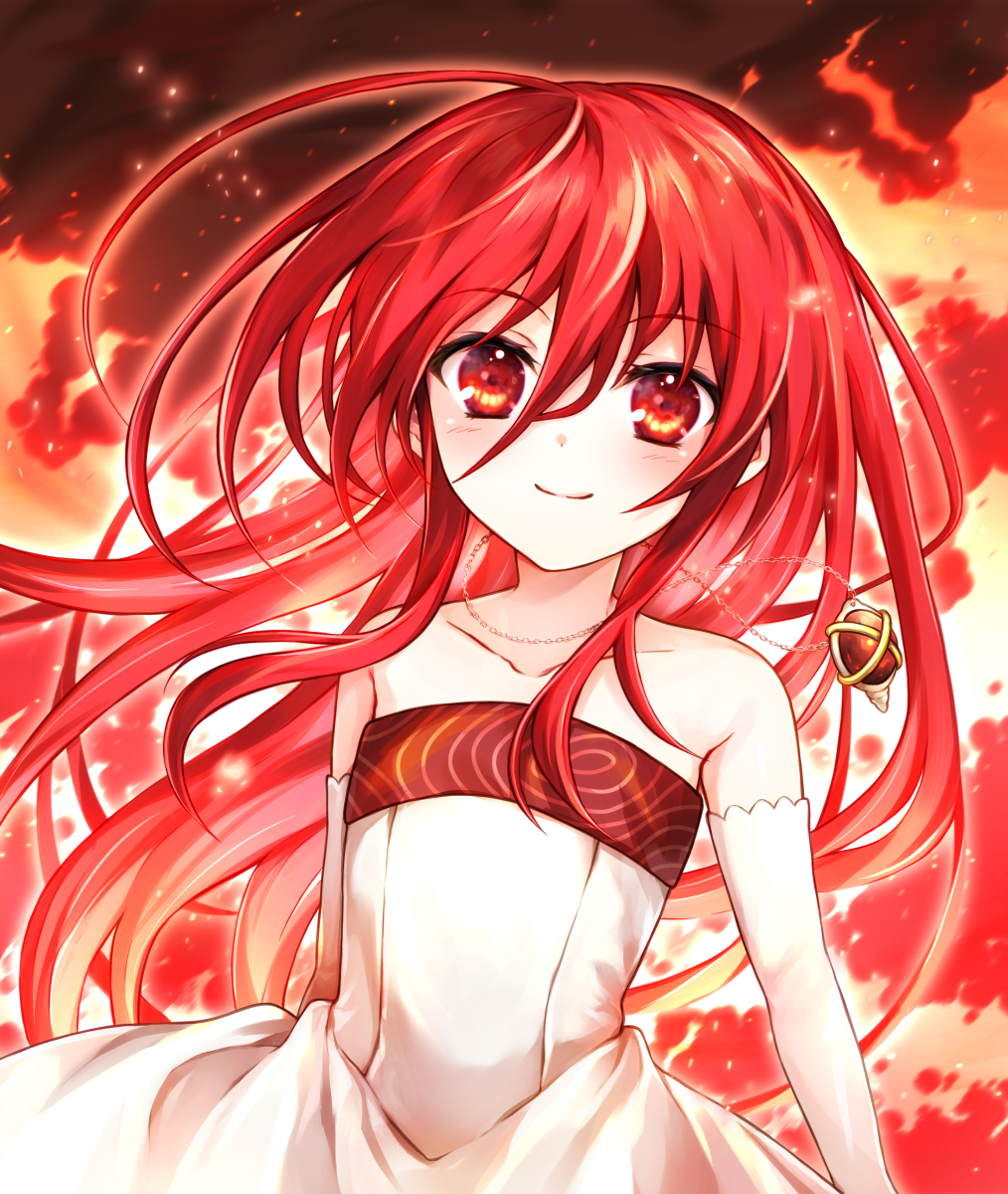 1girl alternate_costume dress elbow_gloves fire gloves highres jewelry long_hair looking_at_viewer pendant red_eyes red_hair shakugan_no_shana shana smile solo strapless strapless_dress tachitsu_teto very_long_hair white_dress white_gloves