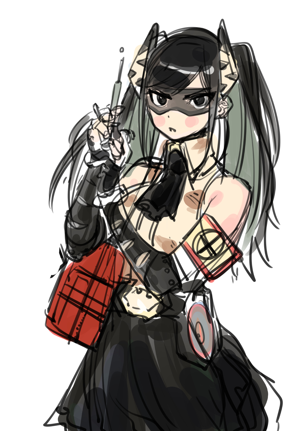 1girl :o armband artist_name bandaid bare_shoulders black_gloves black_hair breasts bukimi_isan commentary_request dunant_pilse elbow_gloves fingerless_gloves gloves goggles highres holding holding_syringe lady_black_(shy) long_hair looking_at_viewer medium_breasts open_mouth shiny_skin shy_(series) simple_background solo syringe translation_request twintails unfinished upper_body