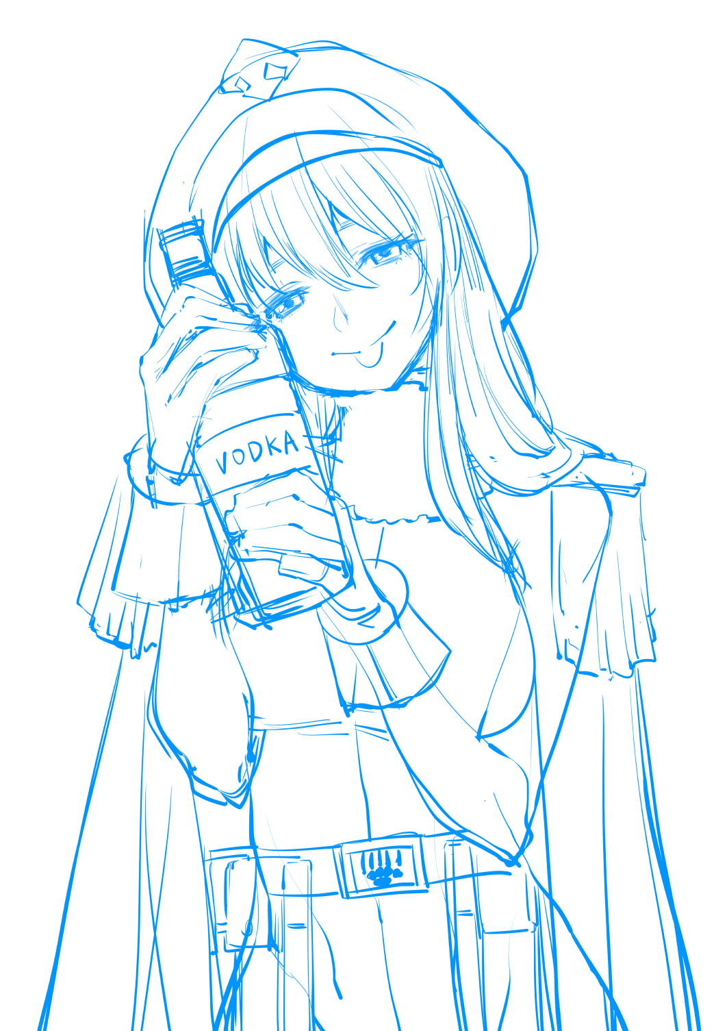 1girl alcohol andreanof_pepesha belt bodysuit bottle breasts bukimi_isan closed_mouth cowboy_shot fur_collar gloves hair_between_eyes hat highres holding holding_bottle jacket jacket_on_shoulders large_breasts long_hair monochrome shy_(series) sketch smile solo spirits_(shy) unfinished vodka